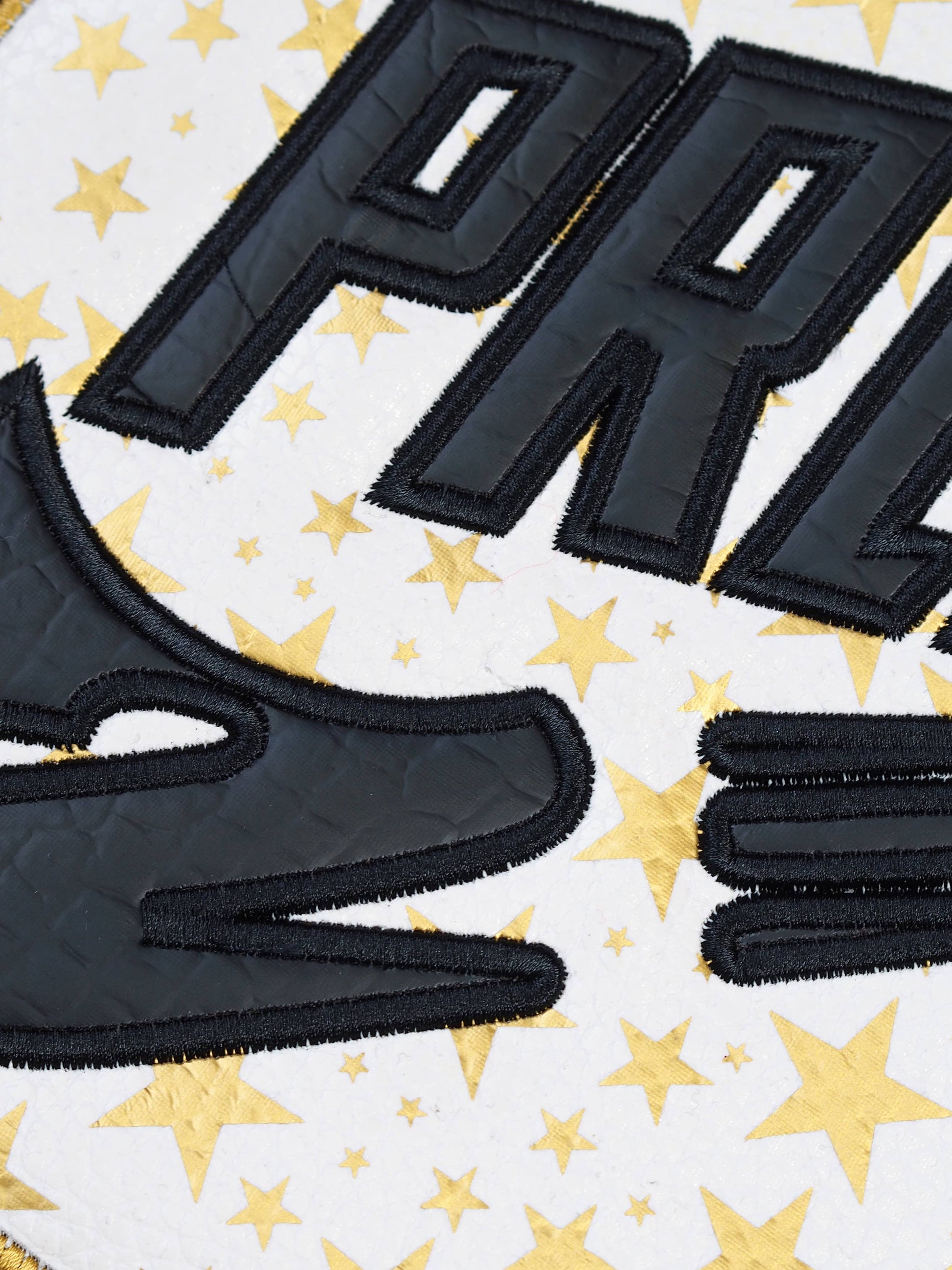 Laser cut Faux-snakeskin applique with black stitched borders and white pebbled faux-leather with gold vinyl detailing and gold stitched borders.