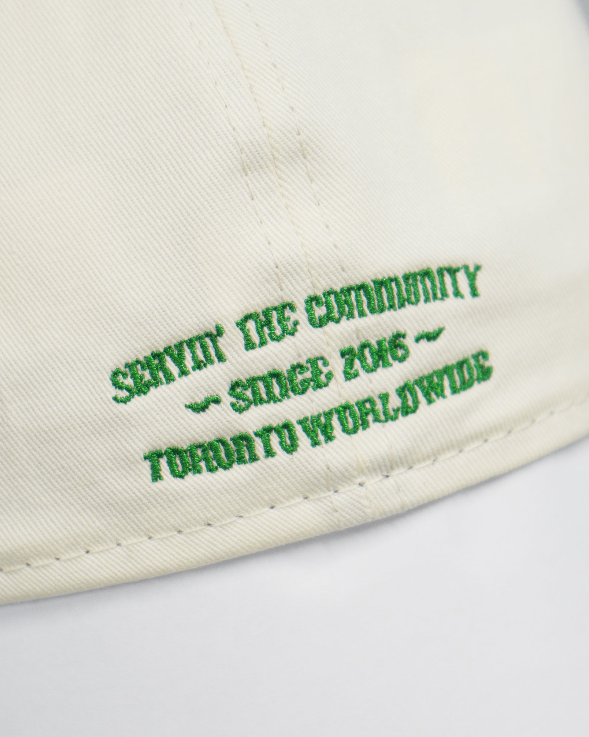 This "Calligraphy Paisley" New Era fitted cap features a puff embroidered "P23" on the front. A matching paisley underbrim. And a flat stitch "Servin' the community - since 2016 - Toronto Worldwide" embellishment on the back.