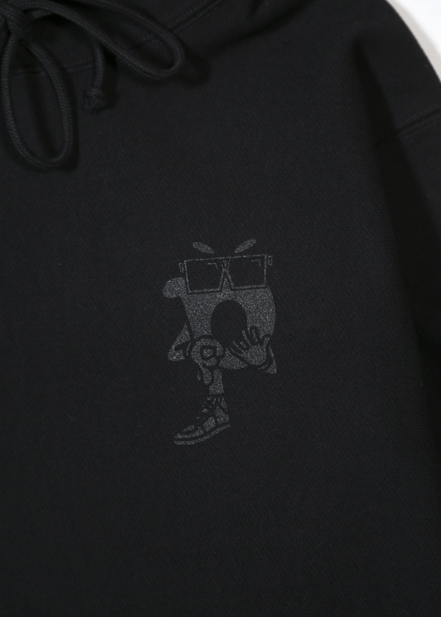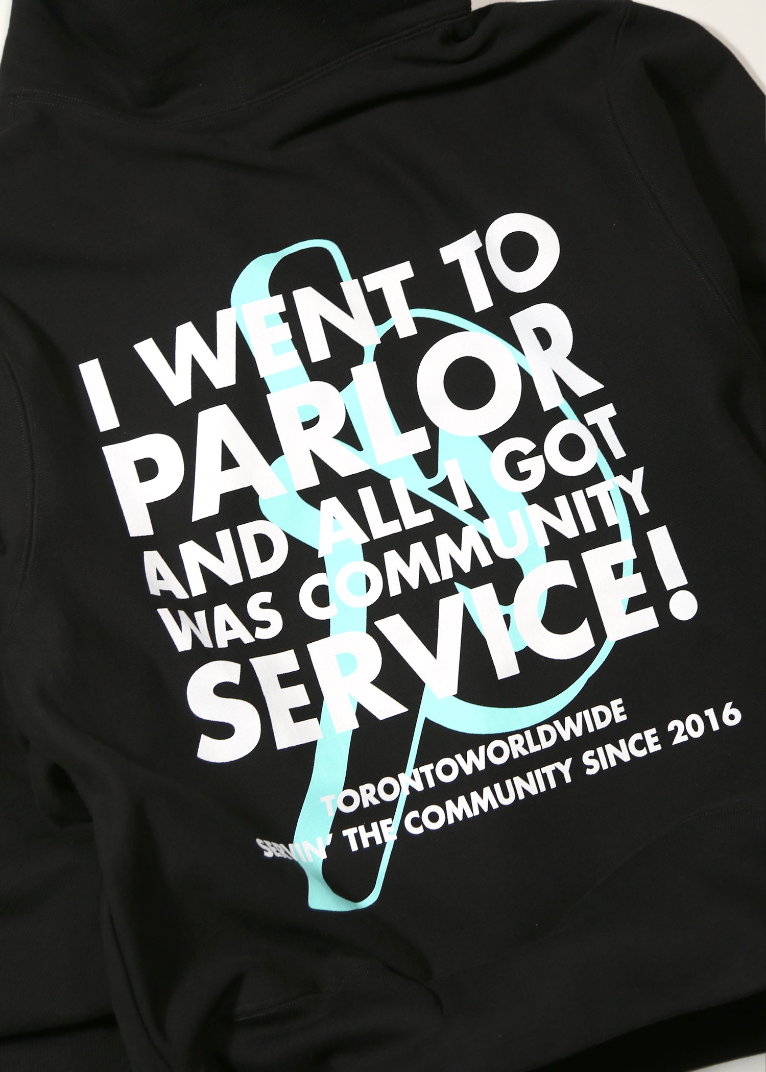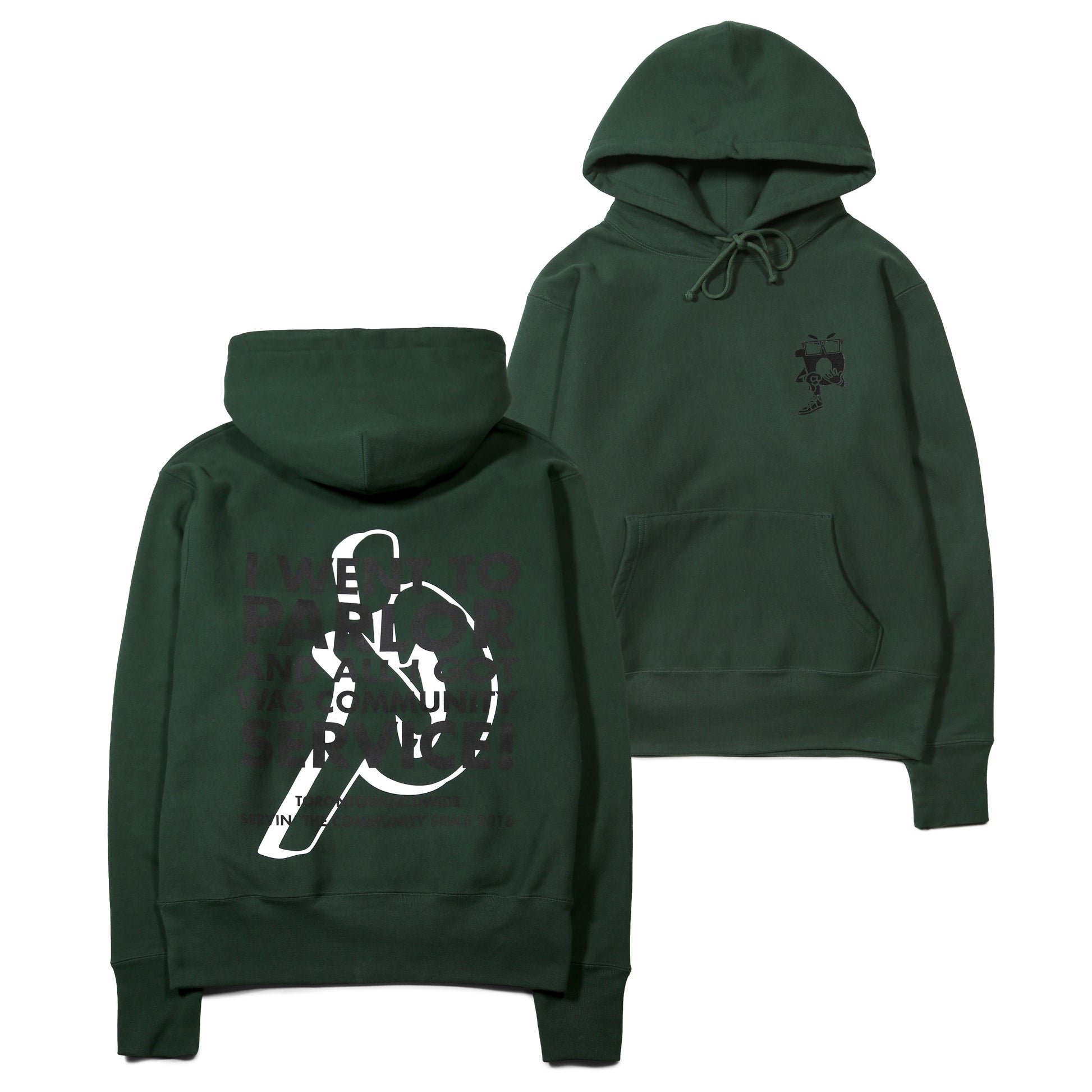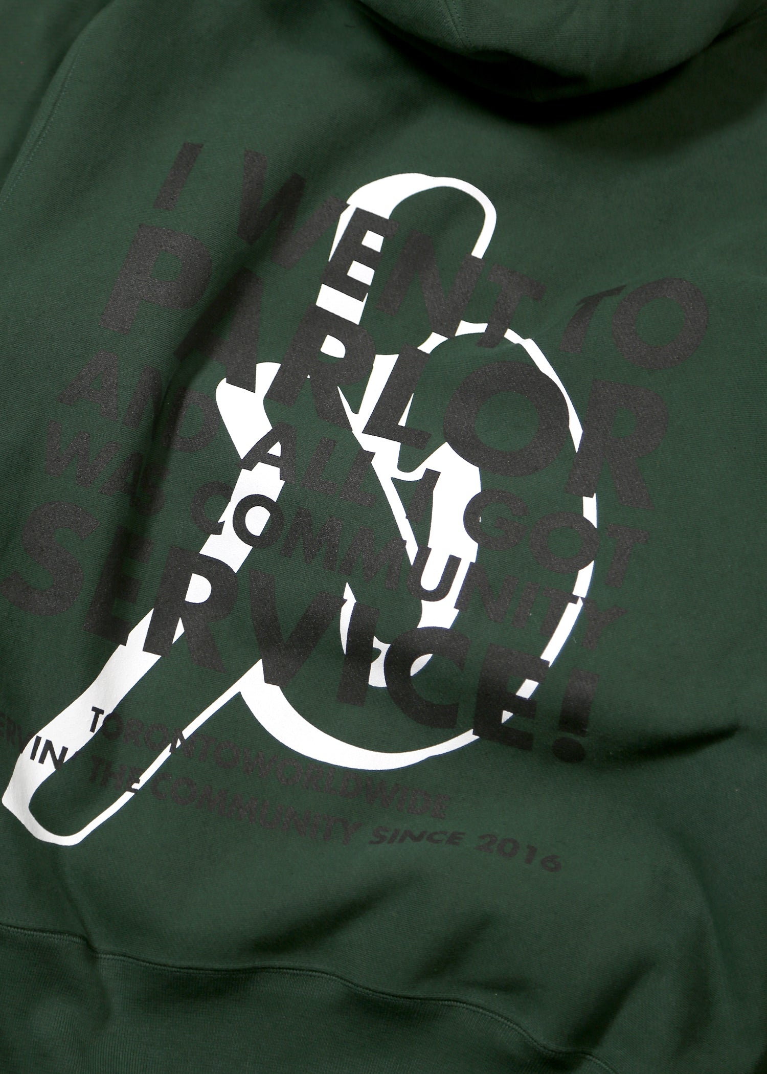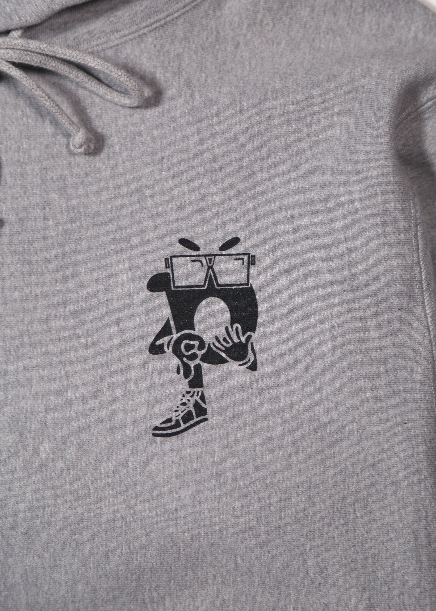 The "Community Service" Hoodie embellishment shown here features a screen printed front chest hit. The throw is on the infamous Goodfoot's "G" character - but with a Parlor twist. Some LV shades, and he's throwing up his "P23" set...