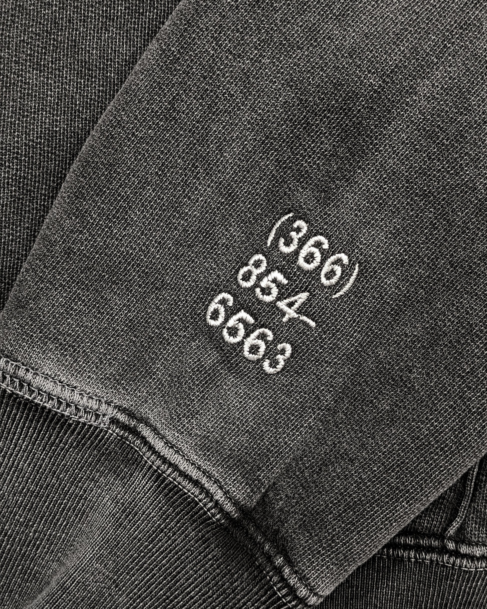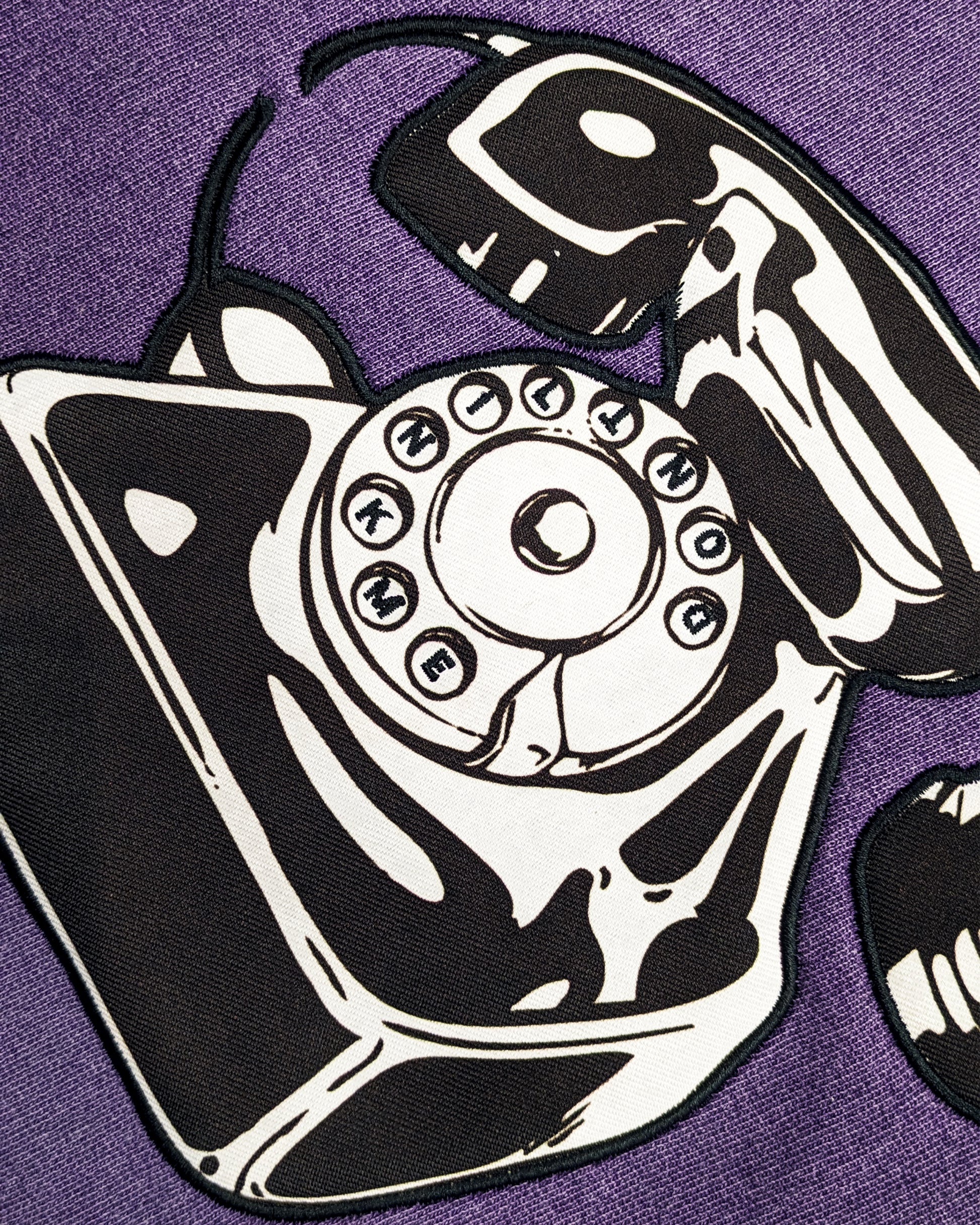 The "Rotary" embellishment shown here features an combination of sublimation & applique embroidery front chest hit, featuring a DON'T LINK ME Rotary Phone. Additionally, (366)-854-6563 embroidered on the left sleeve.
