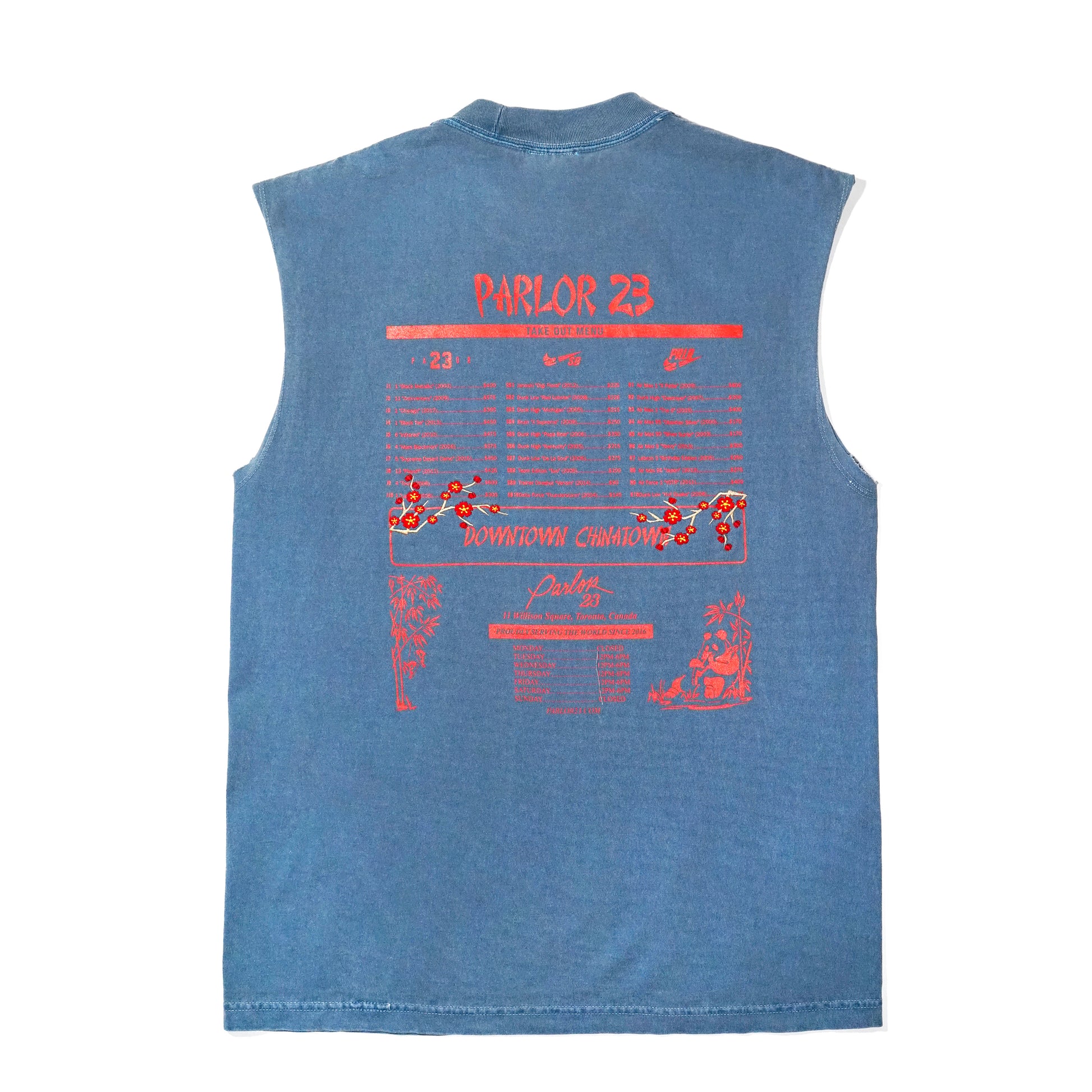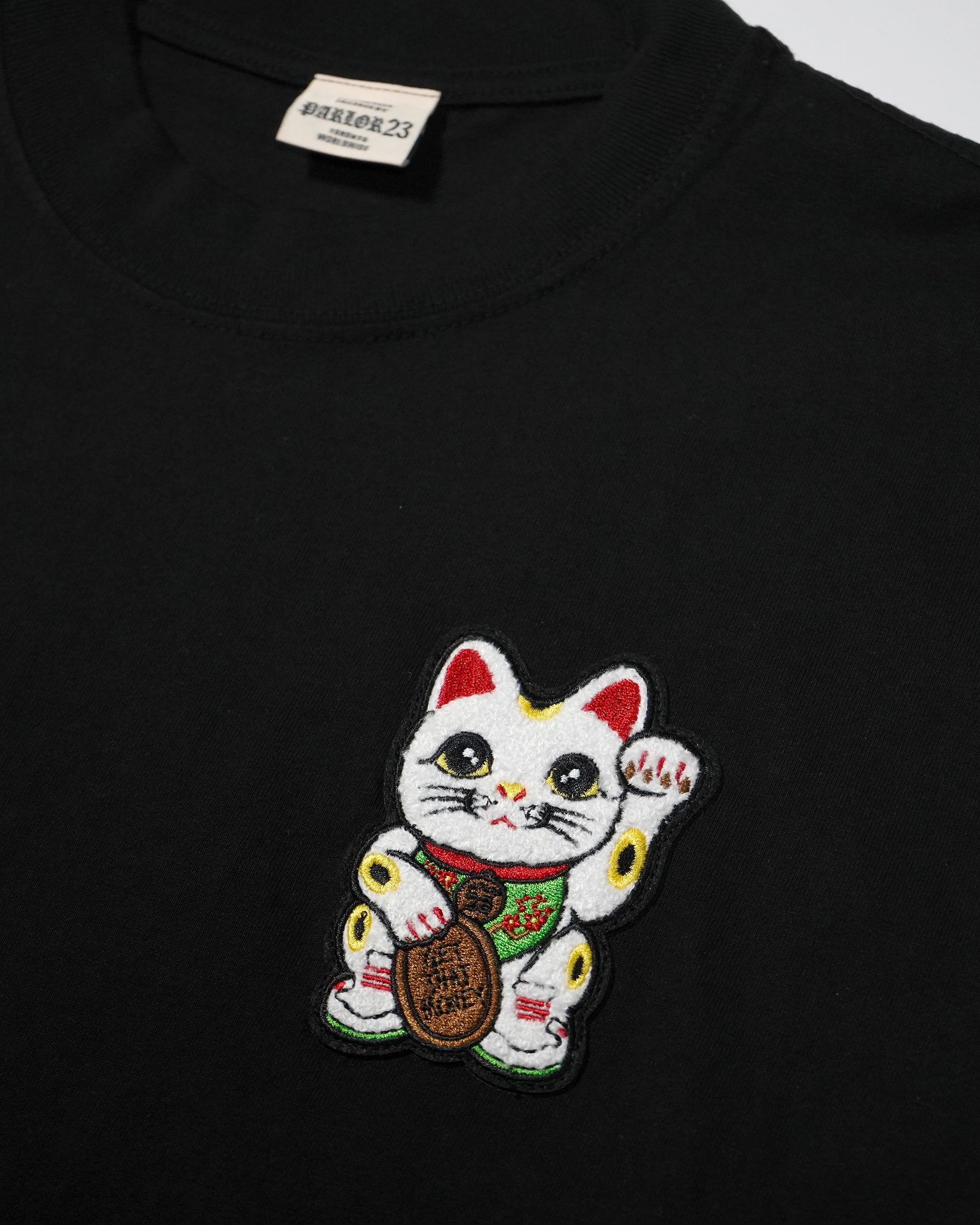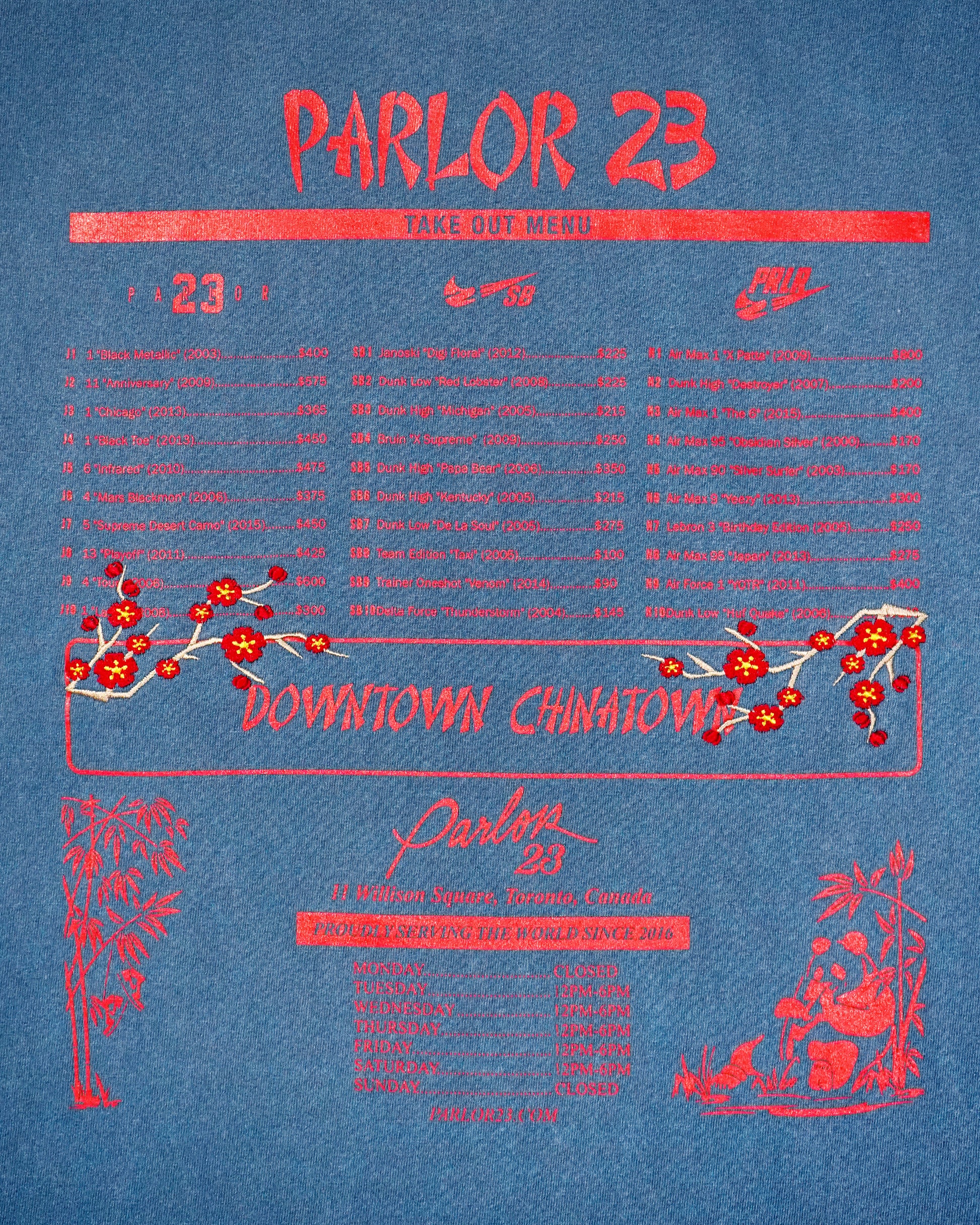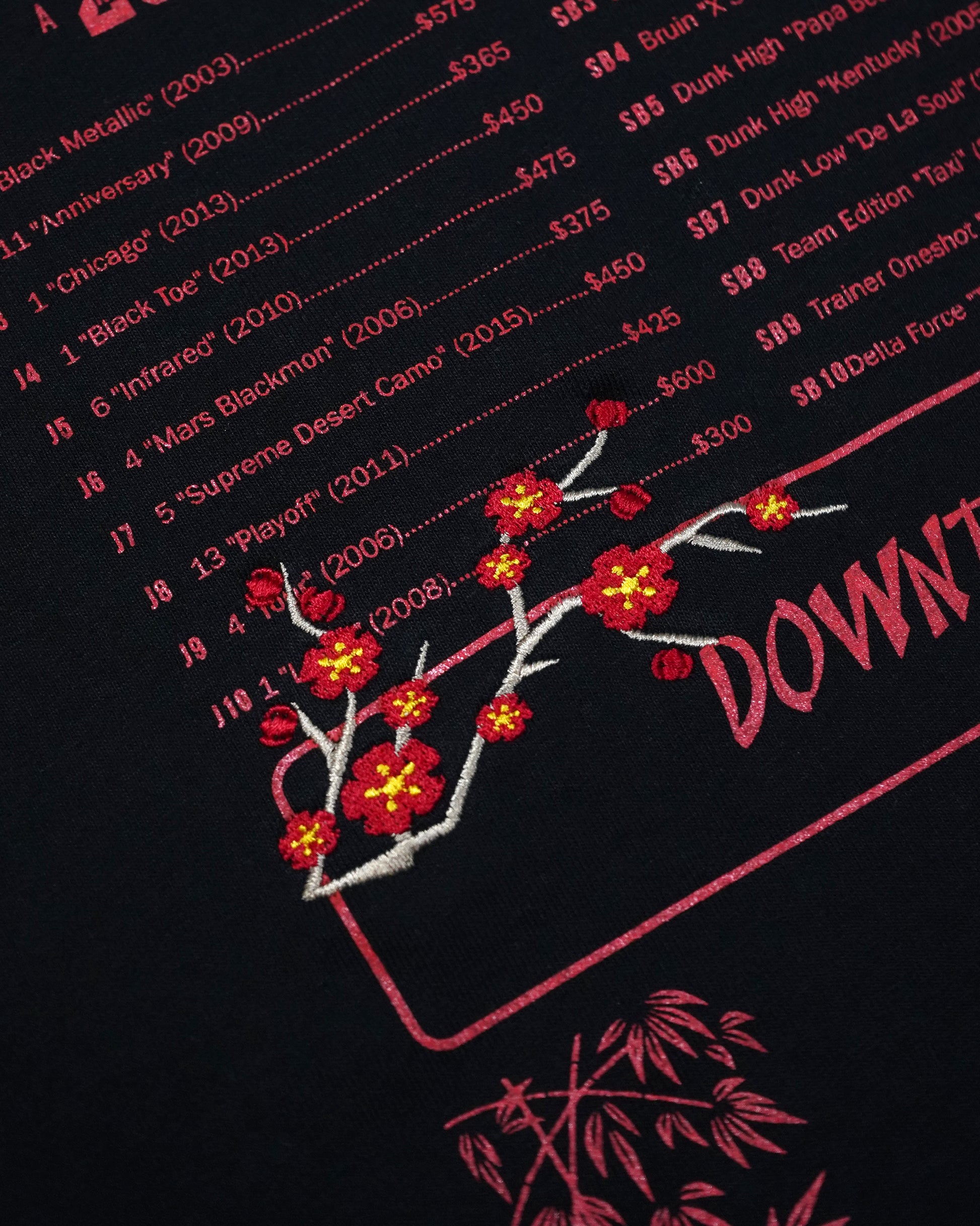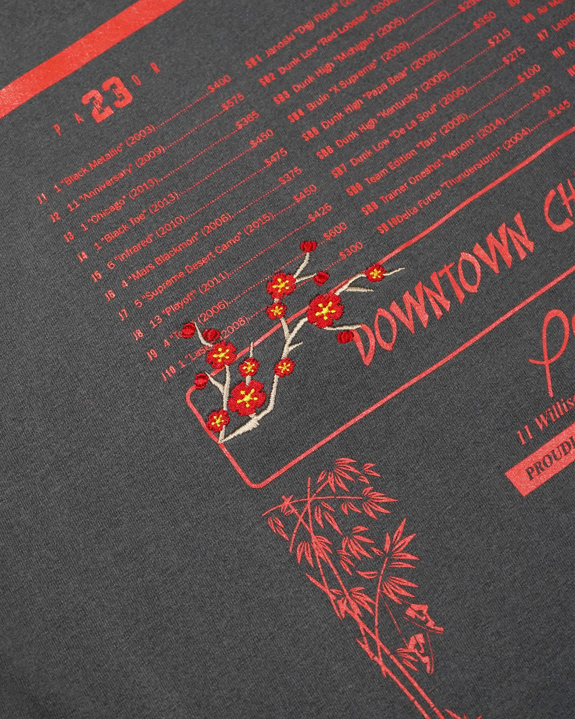 On the back, we flipped our original, opening day inventory - "Menu" graphic originally released in our 1st year of being open. We matched with some embroidered Cherry Blossoms.