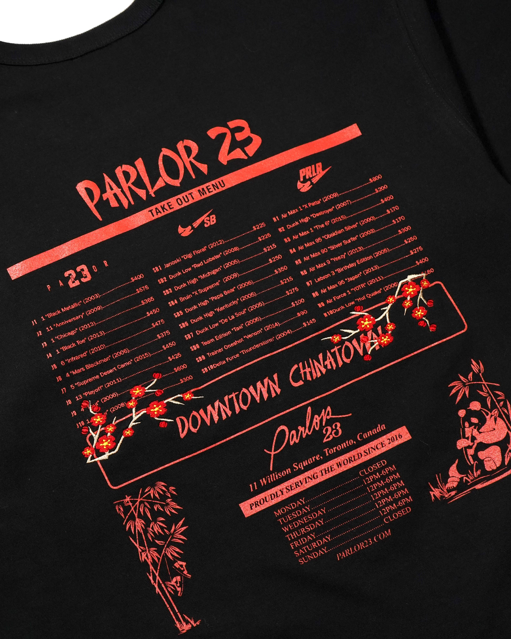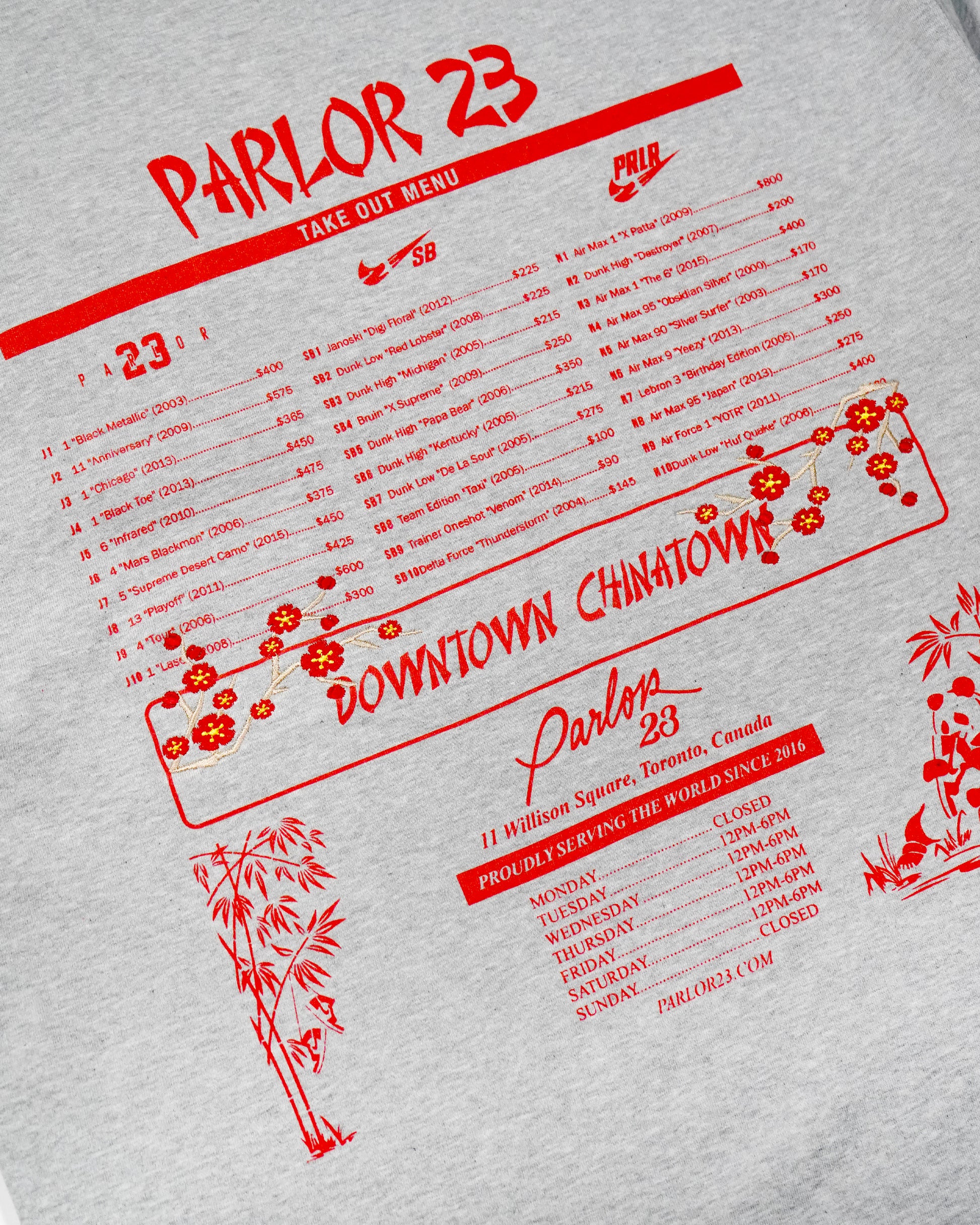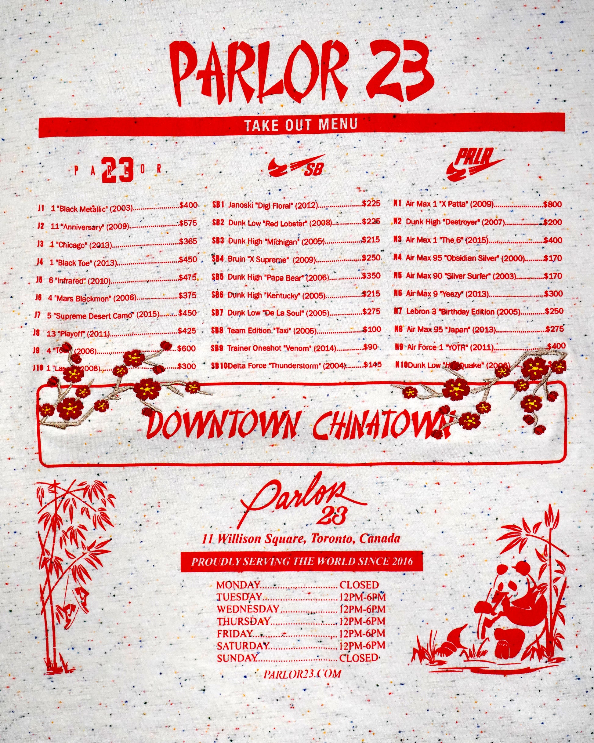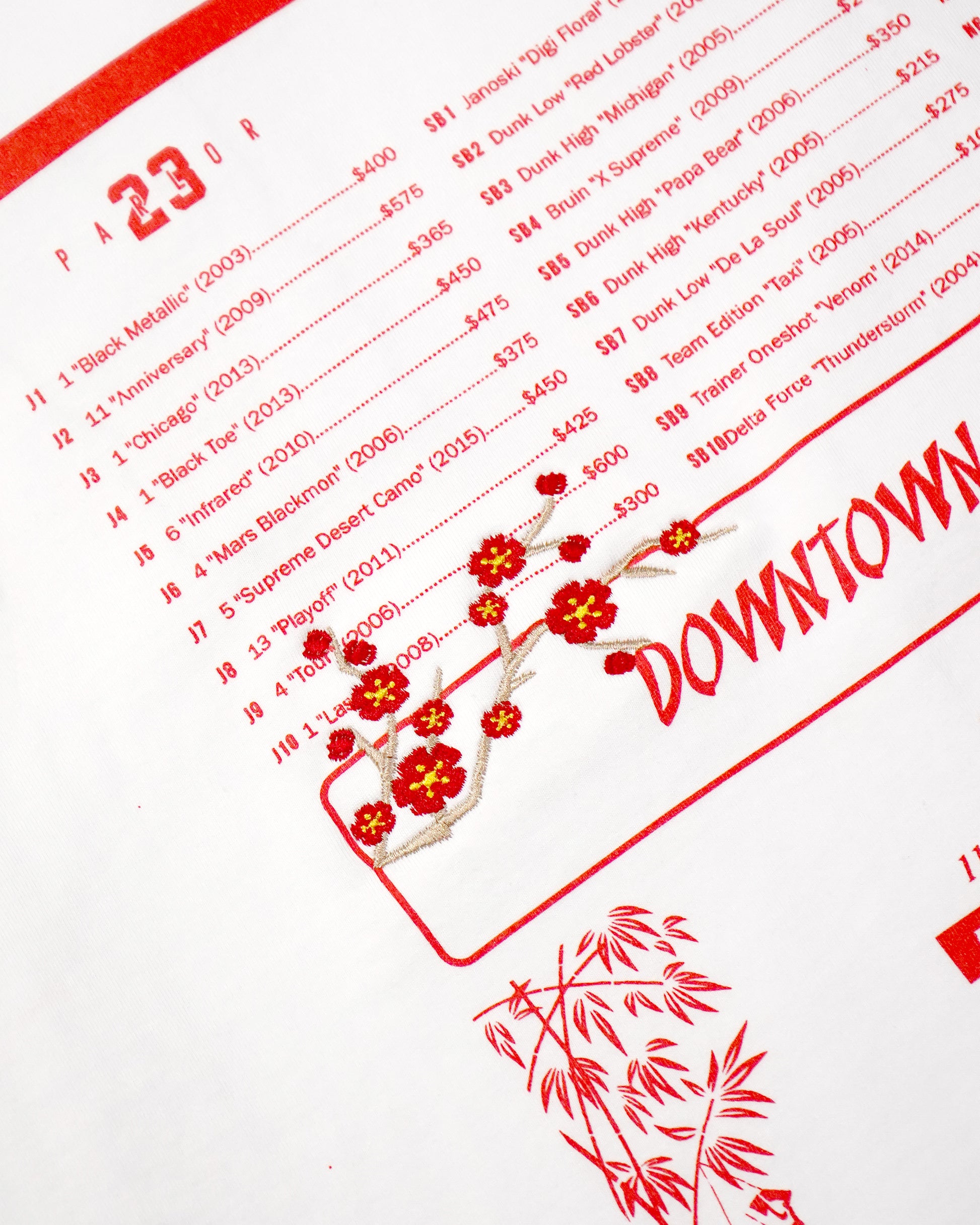 On the back, we flipped our original, opening day inventory - "Menu" graphic originally released in our 1st year of being open. We matched with some embroidered Cherry Blossoms.