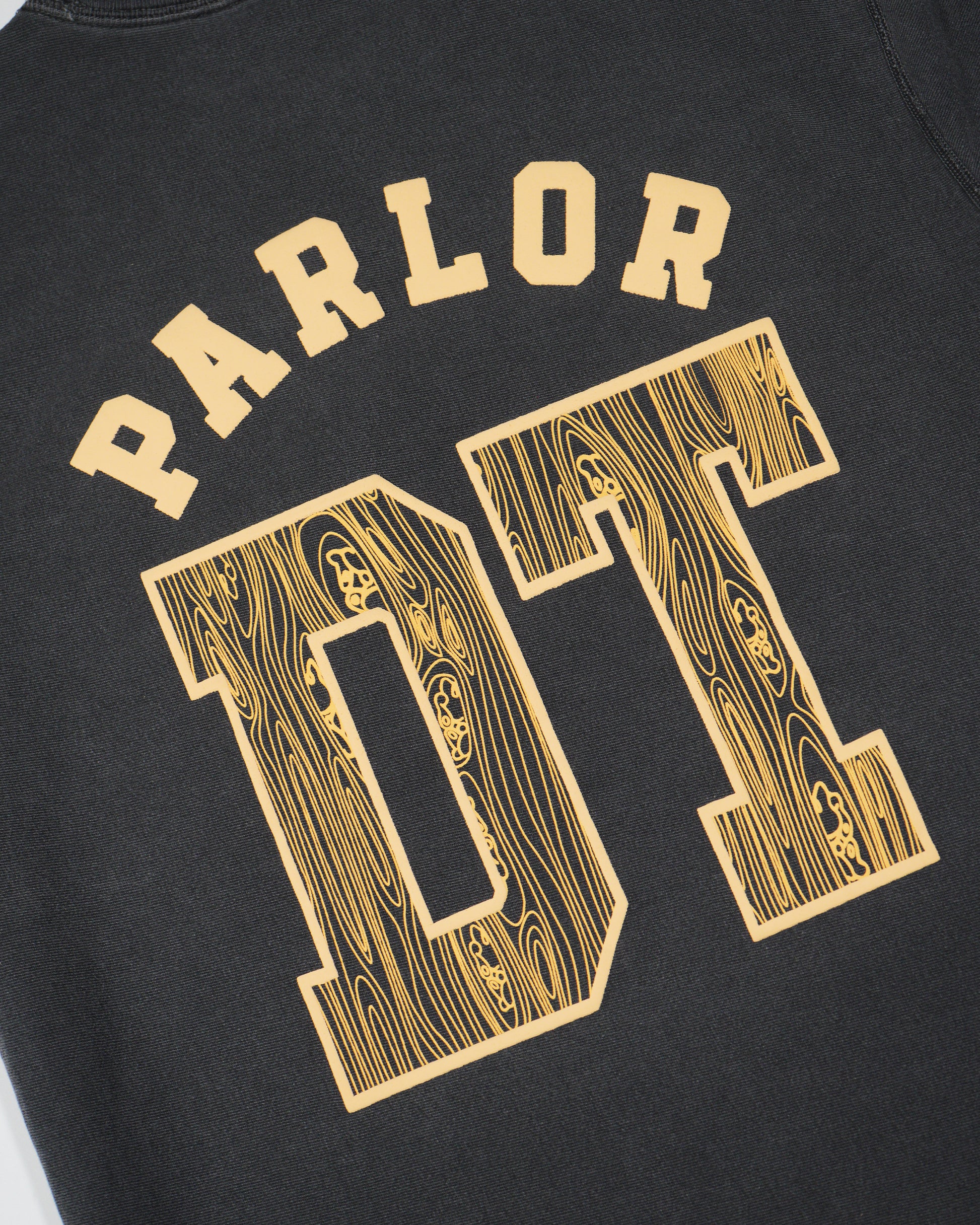 The back graphic is actually a throw on the first graphic we ever did on a garment, our "Jersey". Its features a thick PUFF "PARLOR" and the outline of a "DT".