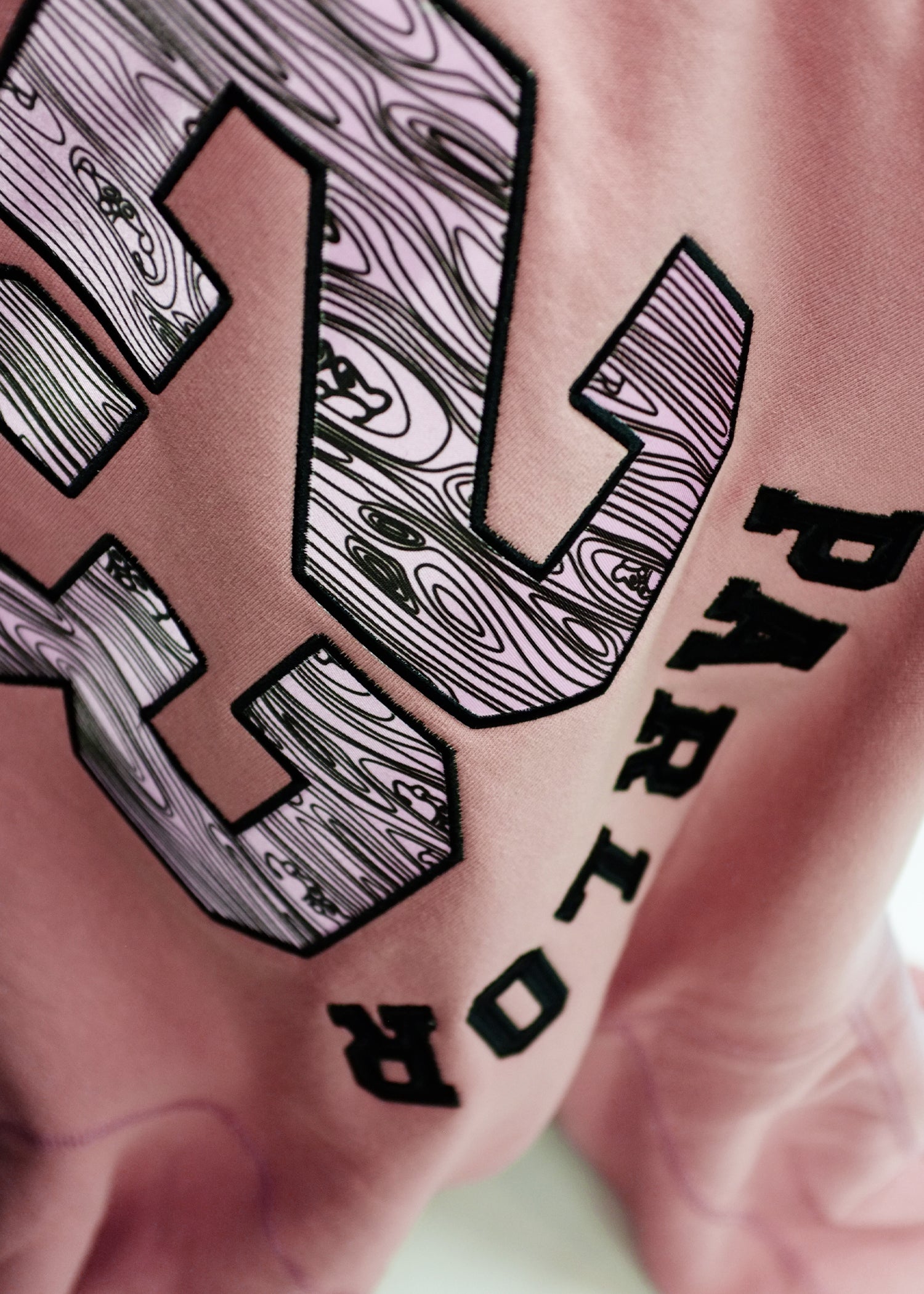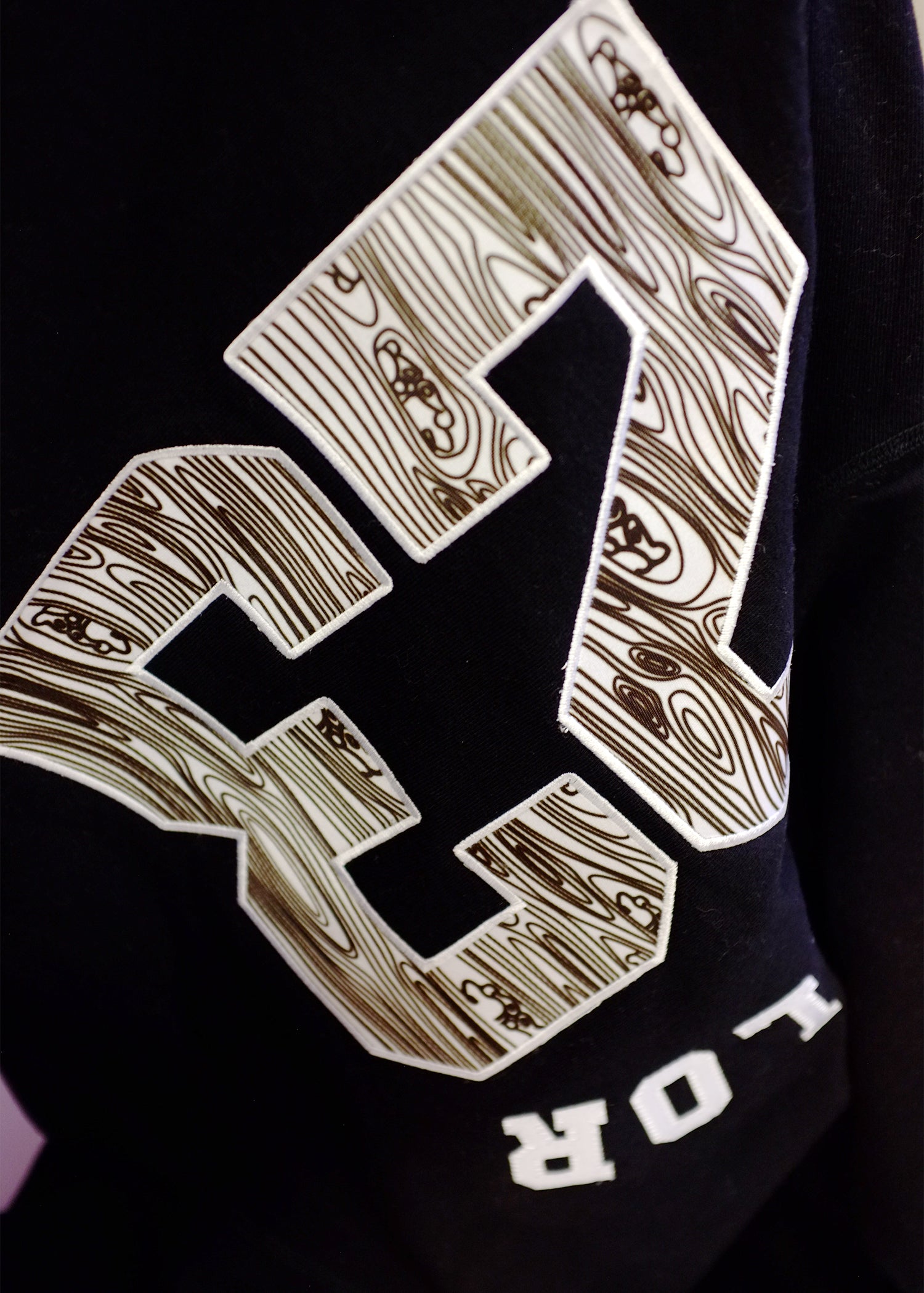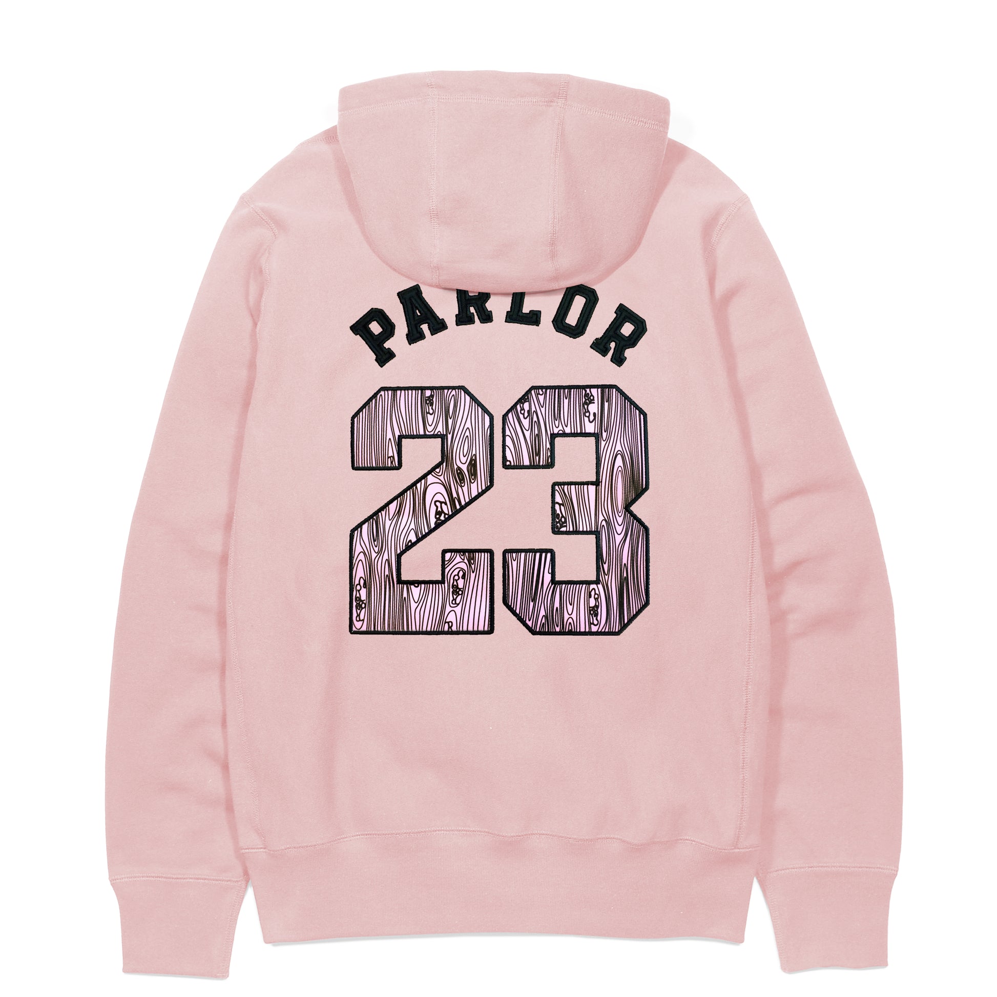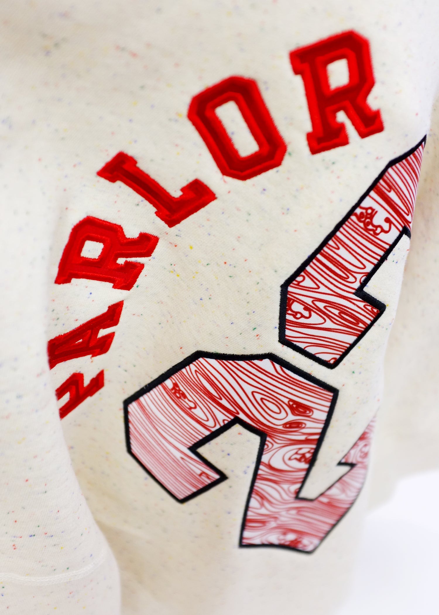 The back graphic is actually a throw on the first graphic we ever did on a garment, our "Jersey". Its features a applique "PARLOR" and the outline of a "23".