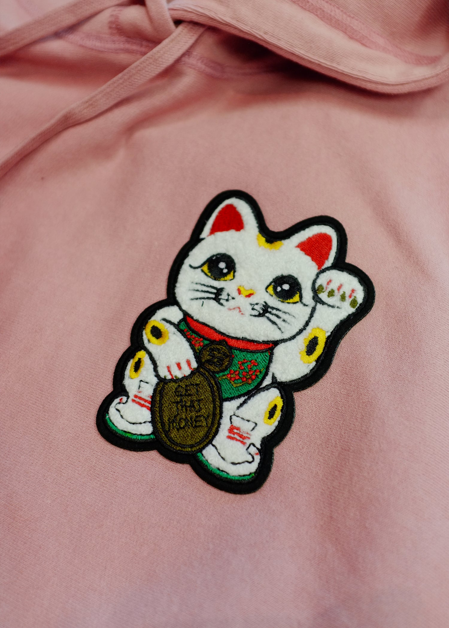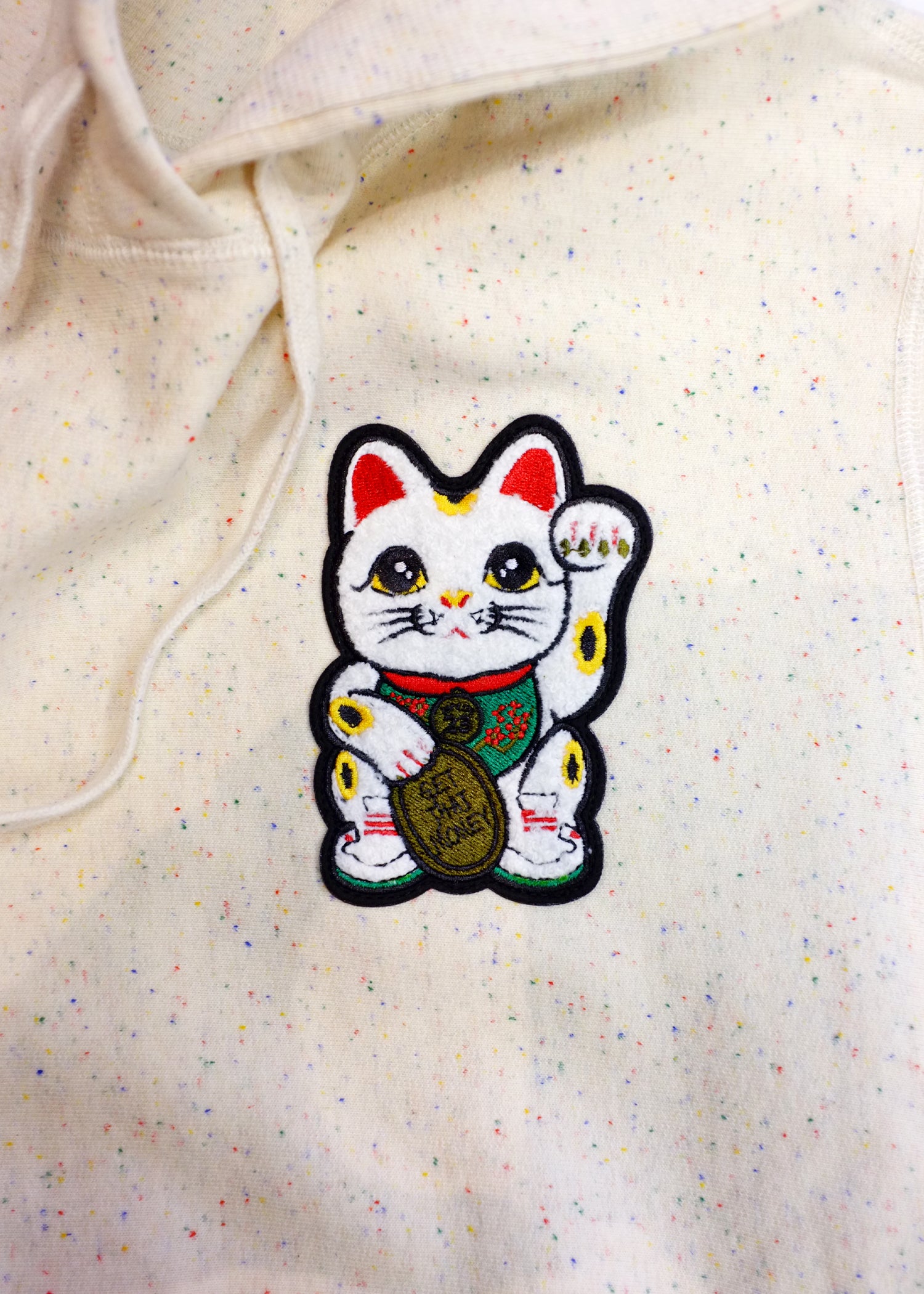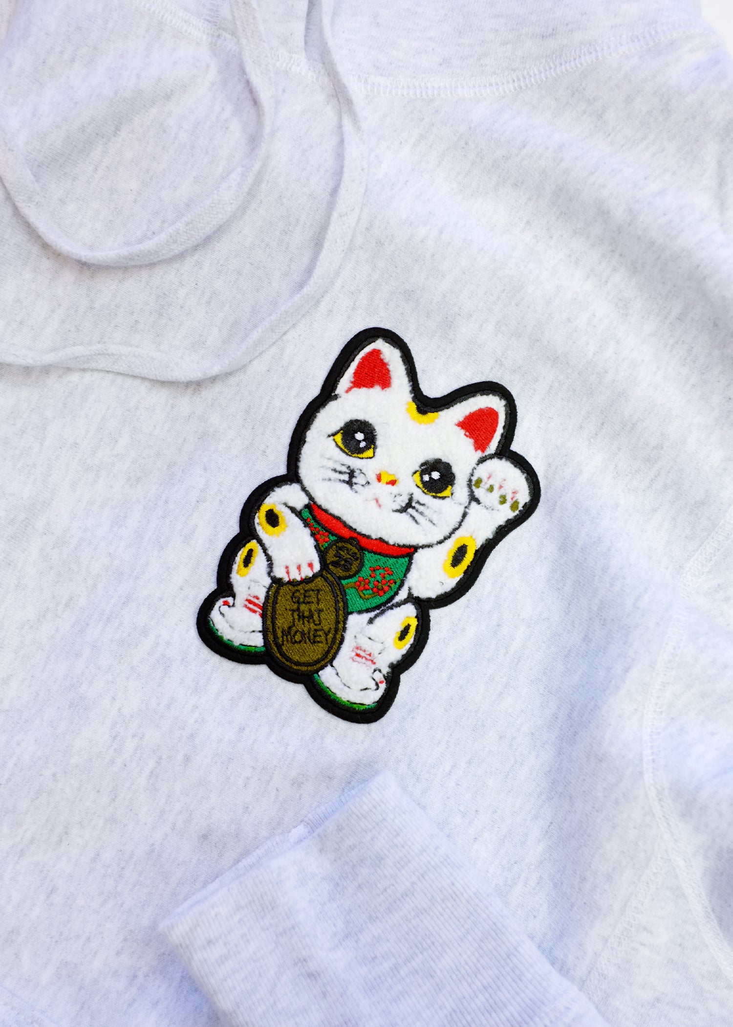 The "Get Money Woodgrain" hoodie embellishment shown here features a combination of Chenille & Embroidered with a front left chest hit of our classic "Get Money Kitty"!
