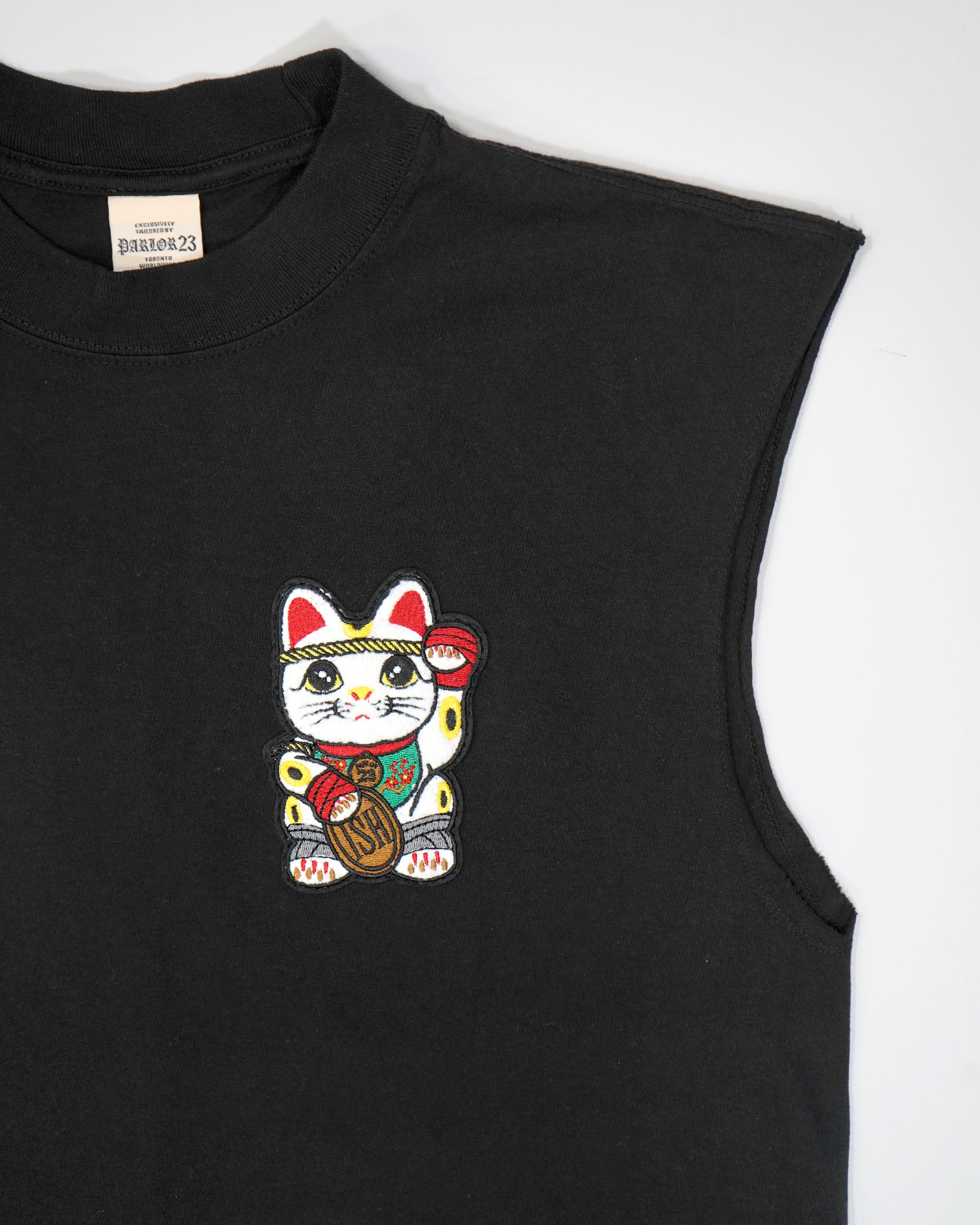 The "Get Money x ISH Promotions" muscle tee embellishment shown here features a combination of Chenille & Embroidery with a front left hit of our ISH Kitty!