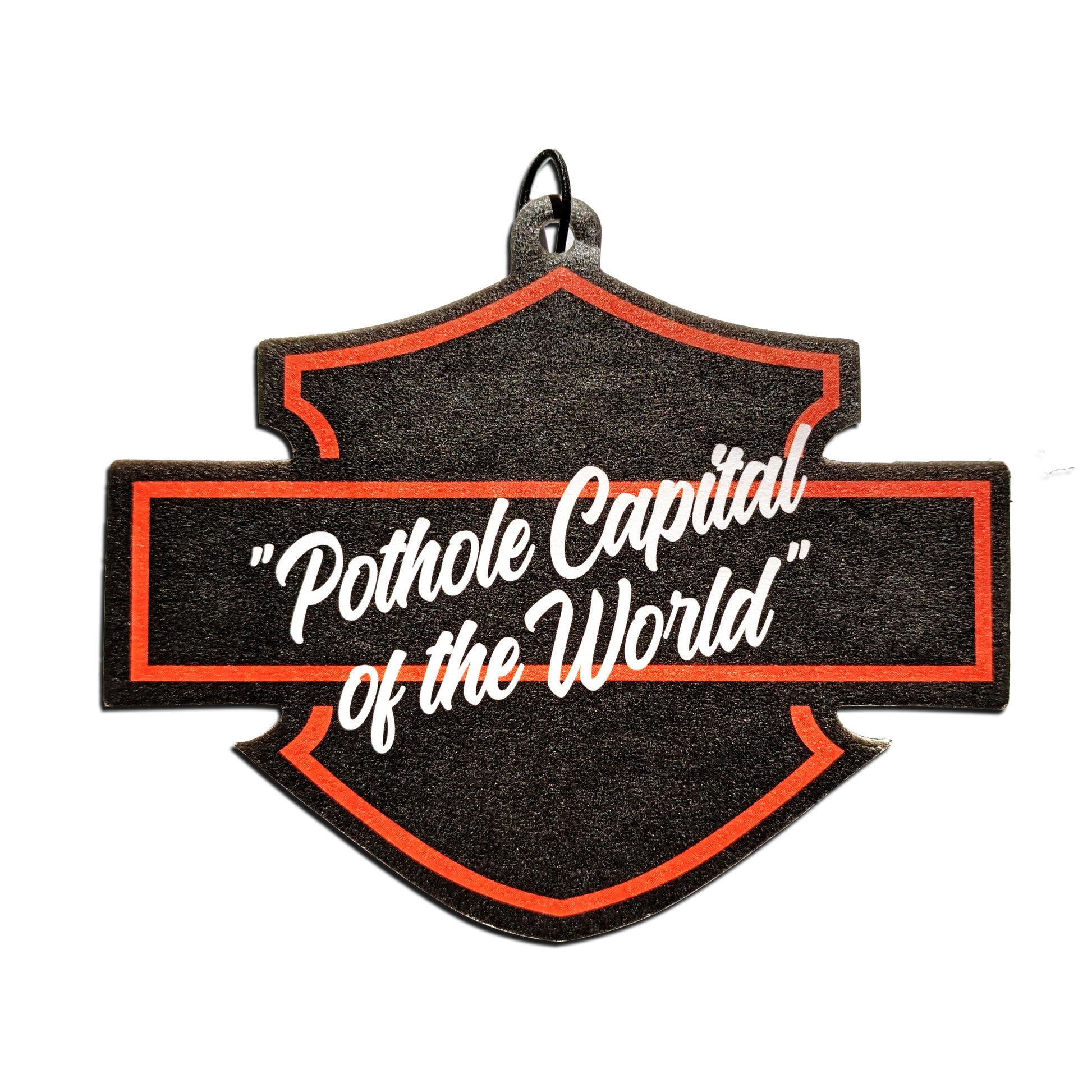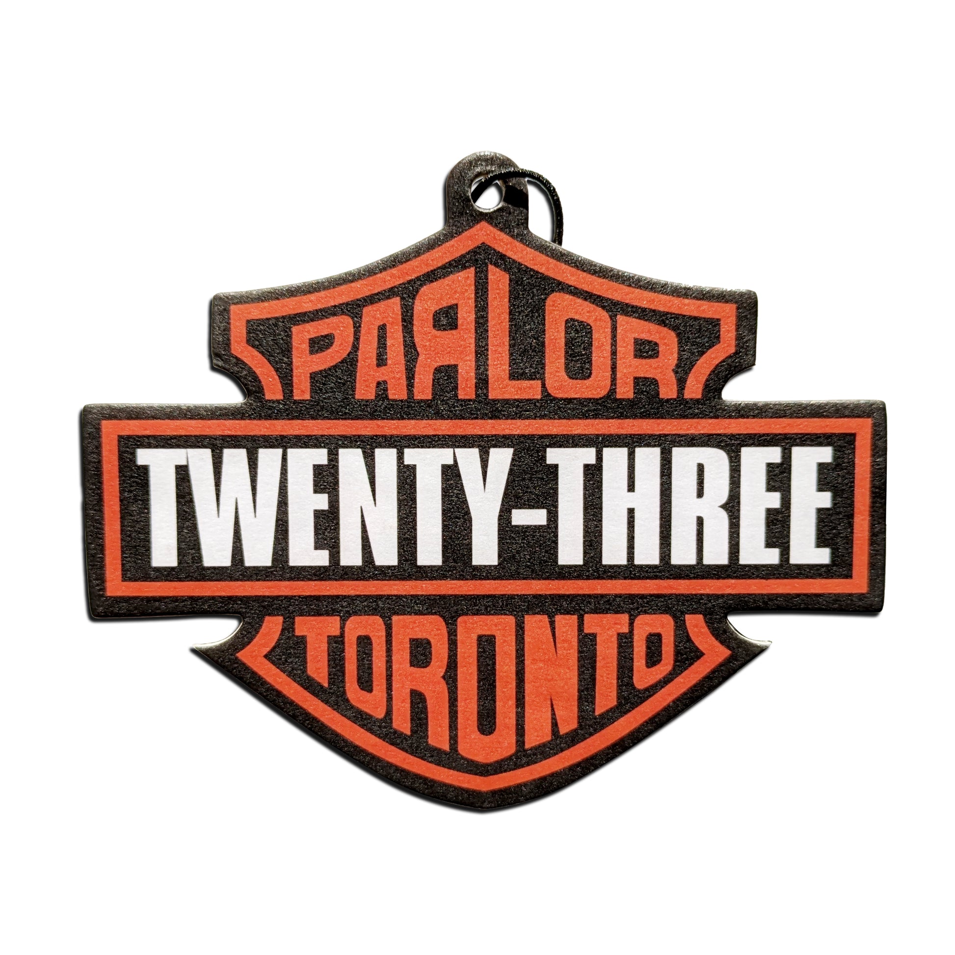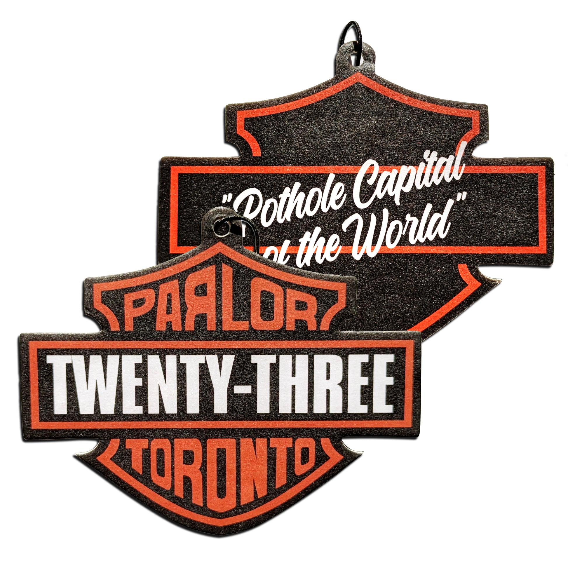 Our "Parley Pot Hole" Air Fresh Aroma is a take on the classic motorcycle brand, with some Toronto homage as the pot hole capital of the world.