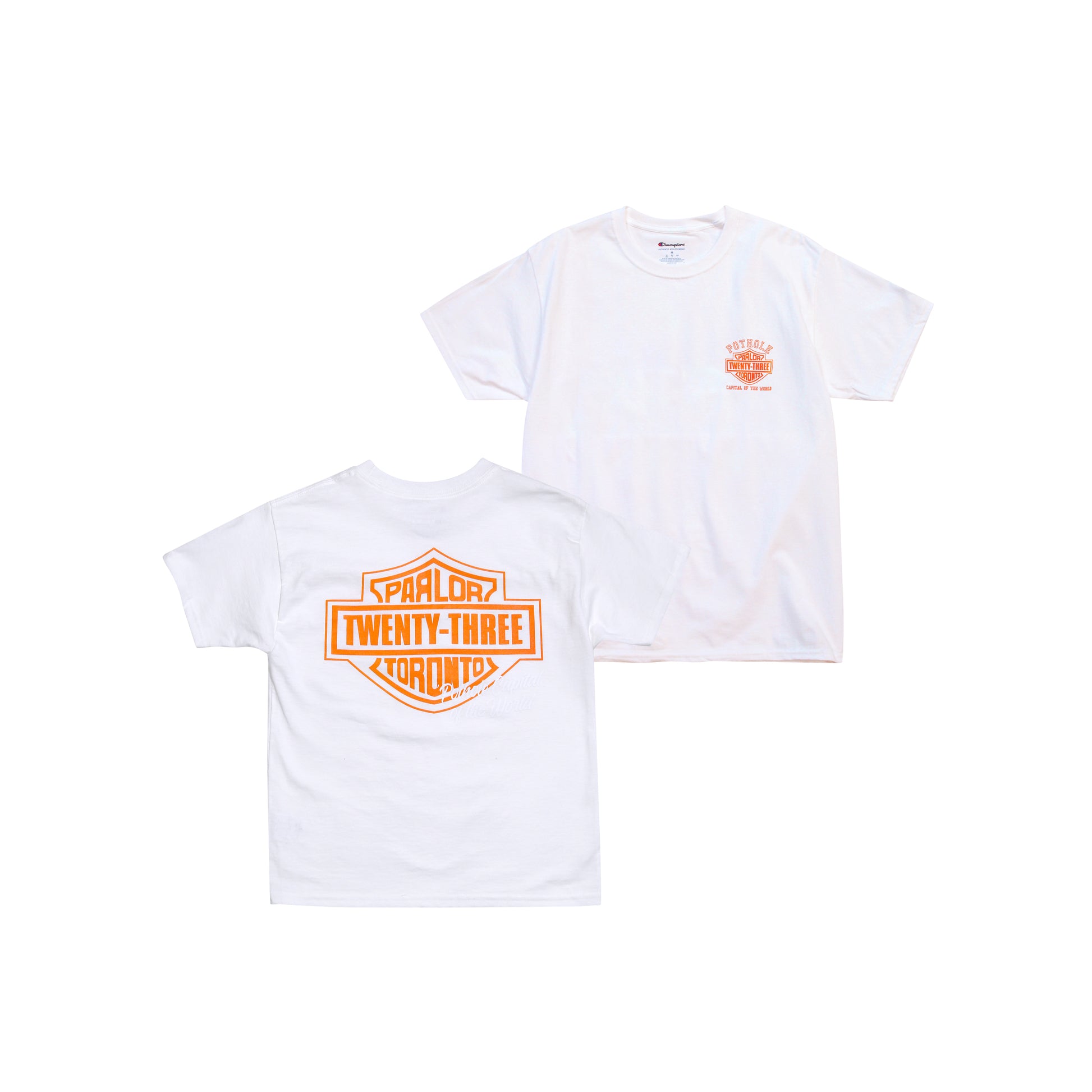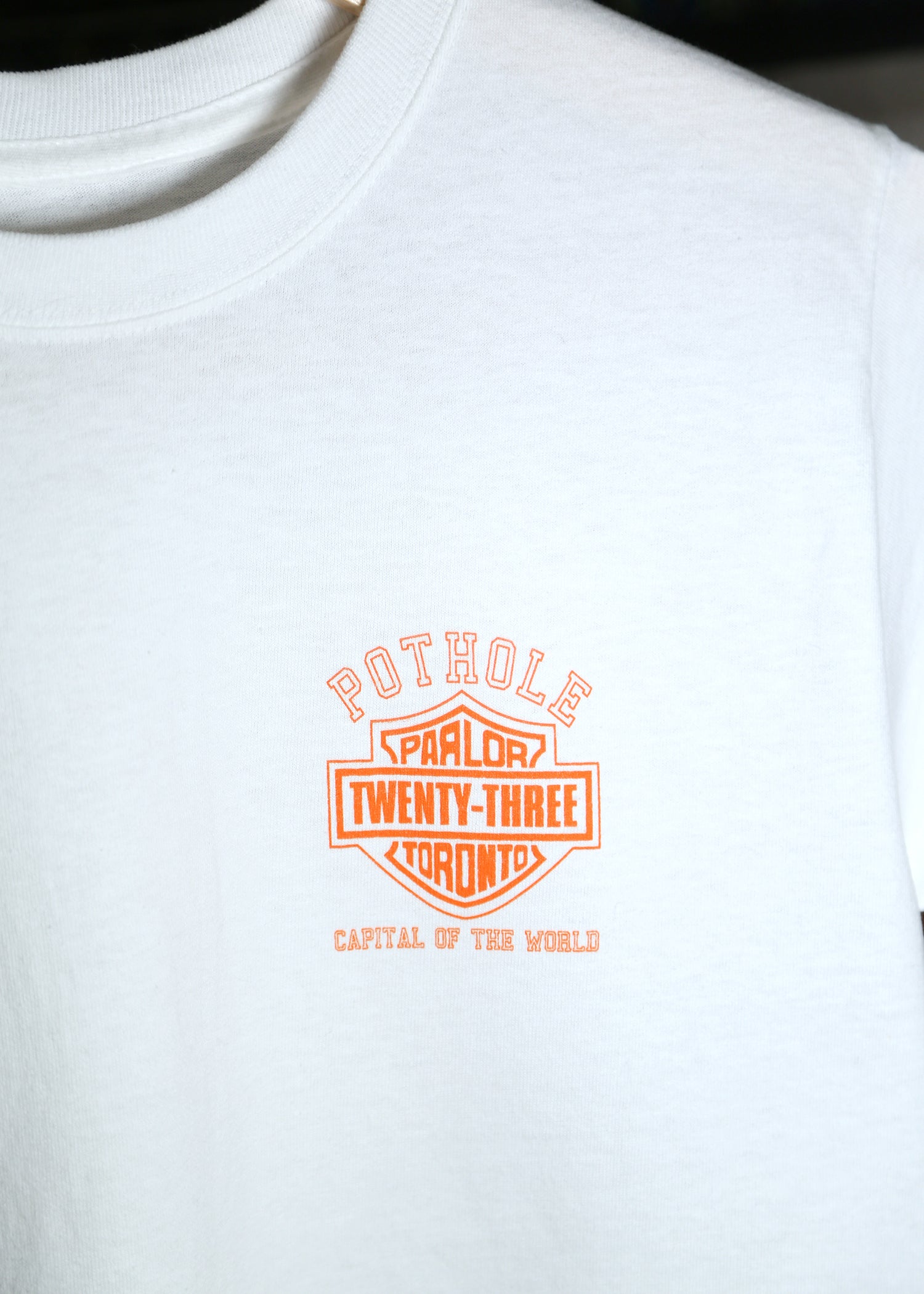 The "Parley Pot Hole" Tee embellishment shown here features a screen printed front left chest hit. The logo is a take on the classic motorcycle brand, with some Toronto homage as the pot hole capital of the world.