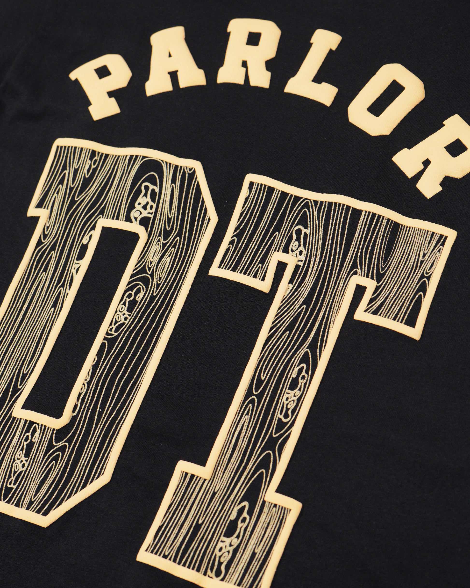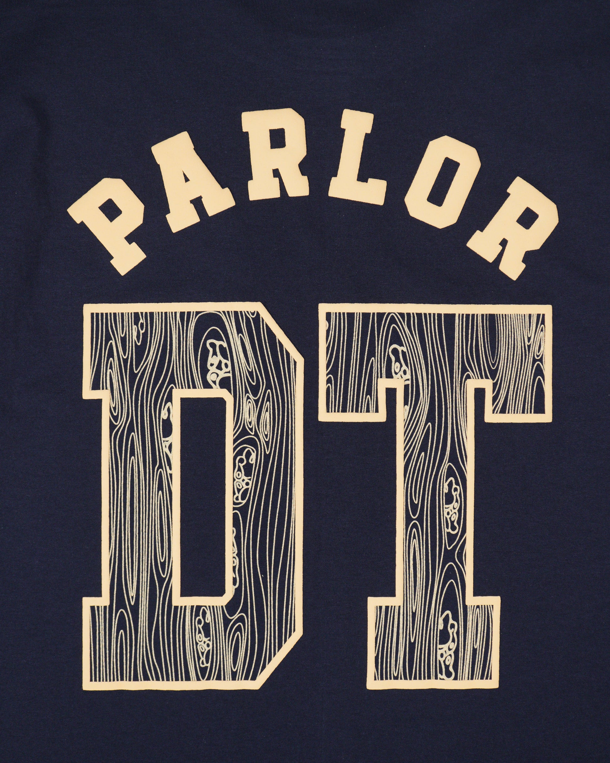 The back graphic is actually a throw on the first graphic we ever did on a garment, our "Jersey". Its features a thick PUFF "PARLOR" and the outline of a "DT".