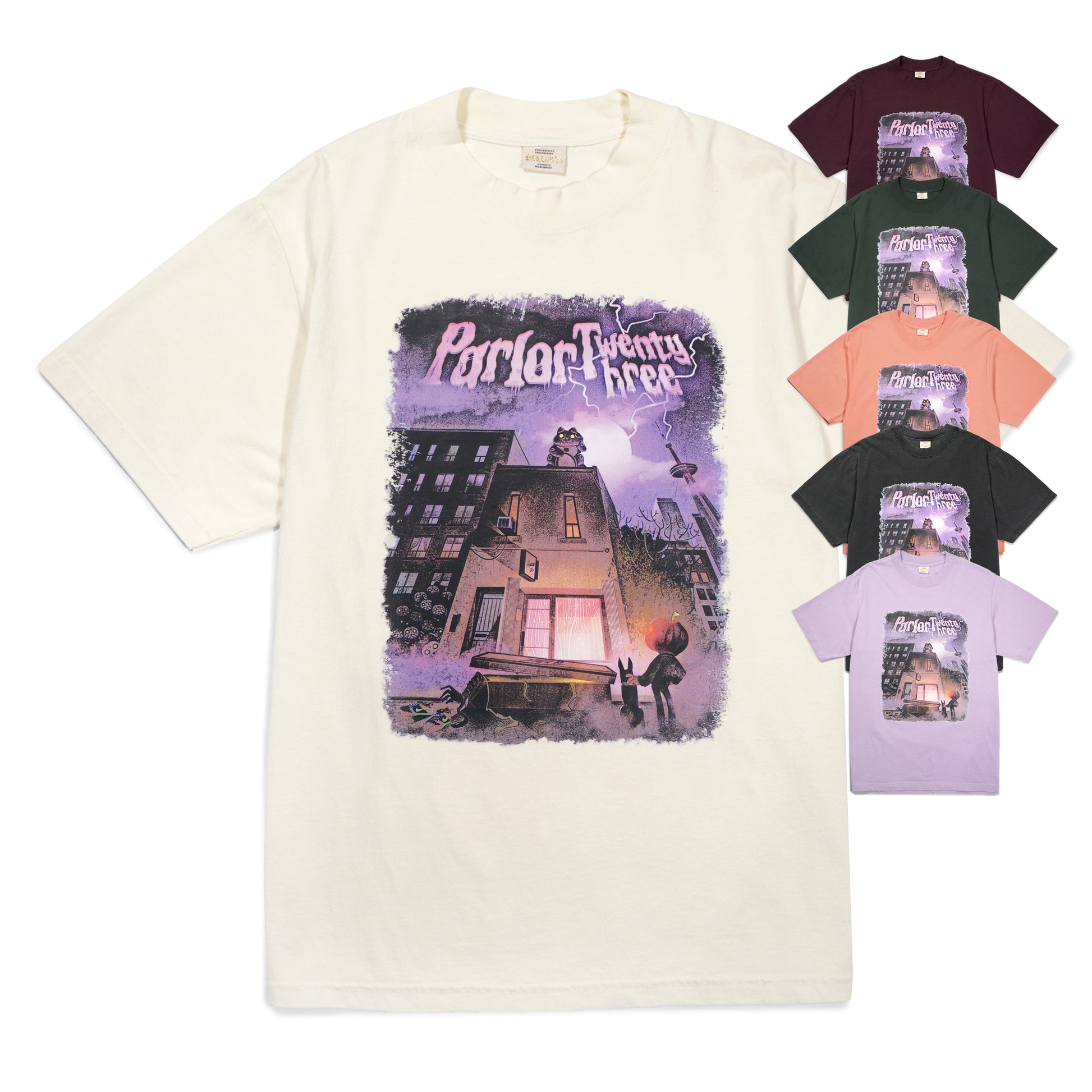 The 100% hand illustrated (thats right - it ain't ai!) front graphic, showcases a spooky version of our 11 Willison Square shoppe. From skeleton money cats, to our skate box decorated as a coffin.. my son posted as a pumpkin head, with companion Krueger (long live), to the unuque building features such as our woodgrain window... Safe to say this graphic is one of our favorites to date..