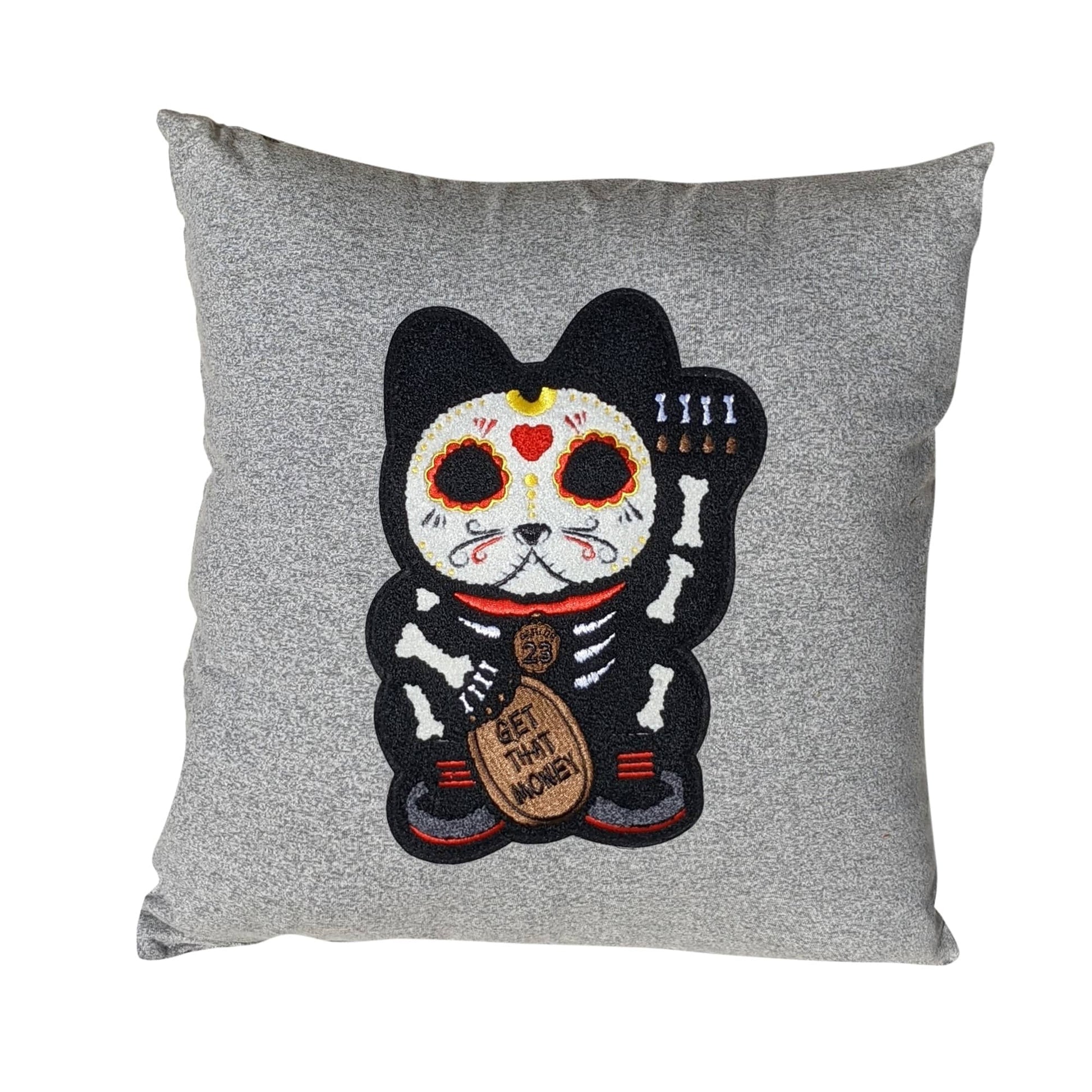 The Parlor 23 "Skeleton Cat" pillow features a 10" Chenille hit on the one side of this 19" X 19" pillow.