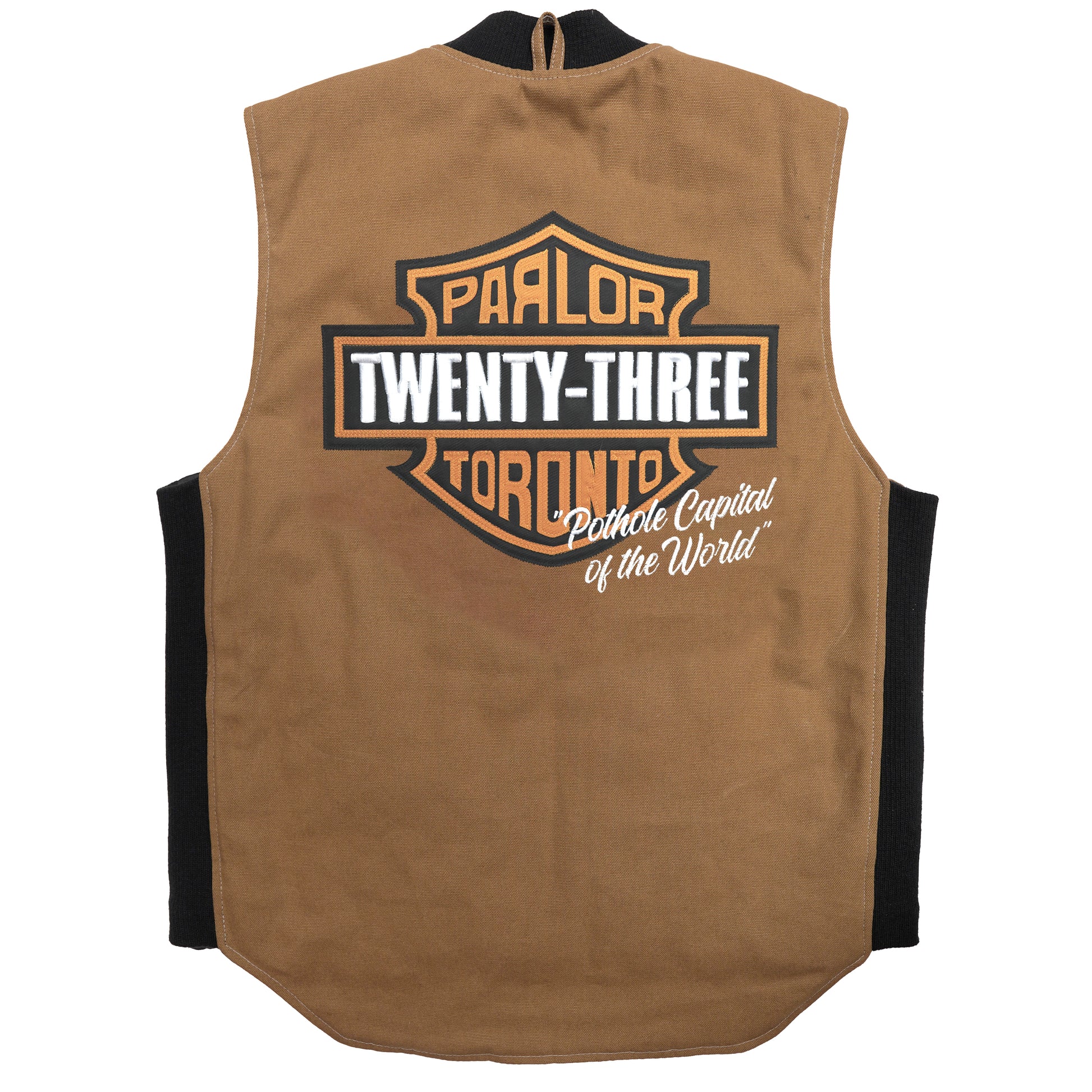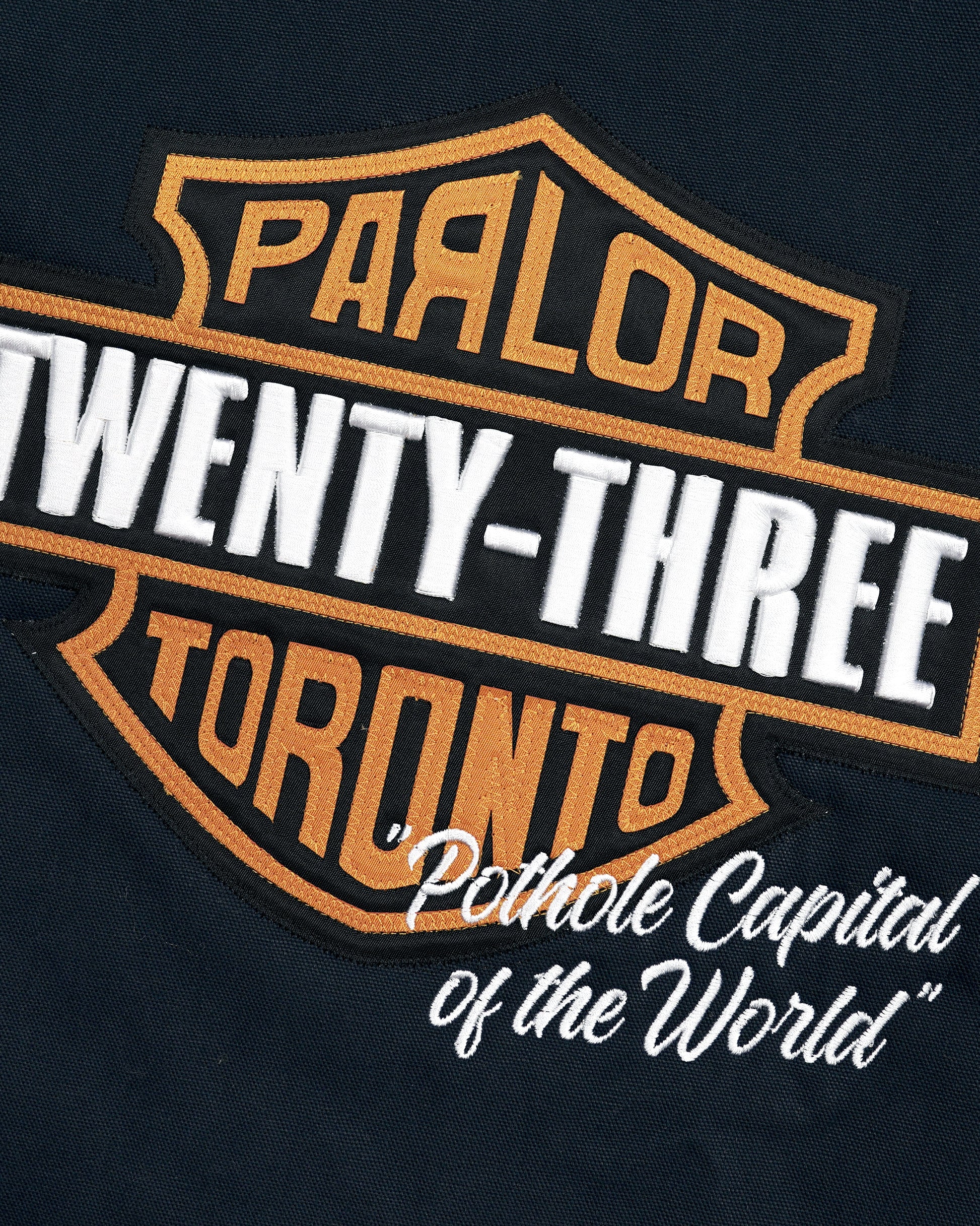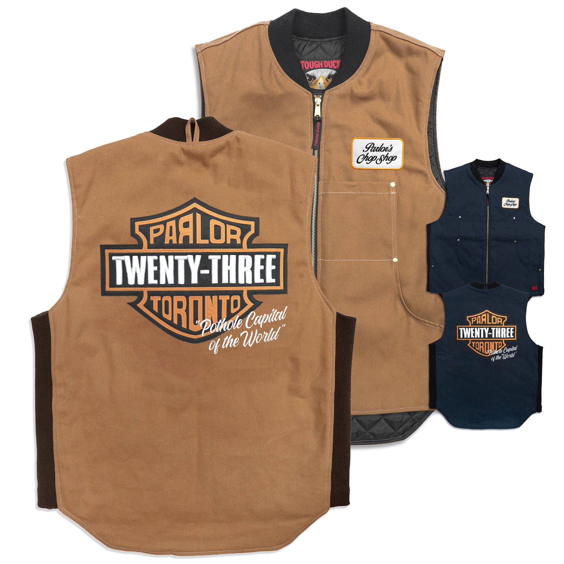 In collaboration with Tough Duck, The "Parley Pot Hole" Moto Vest shown here features an embroidered "Parlor Chop Shop" front left chest patch. The back logo embellishment is a take on the classic motorcycle brand, with some Toronto homage as the pot hole capital of the world. Featuring a 2 layer applique, embroidery and 3D puff embridery.