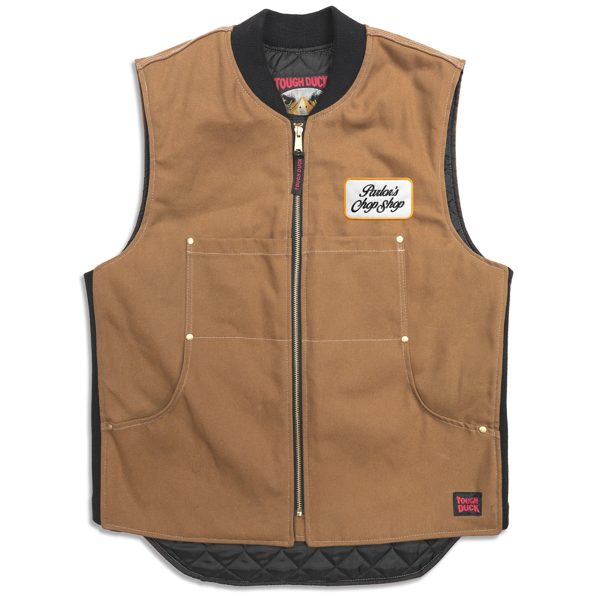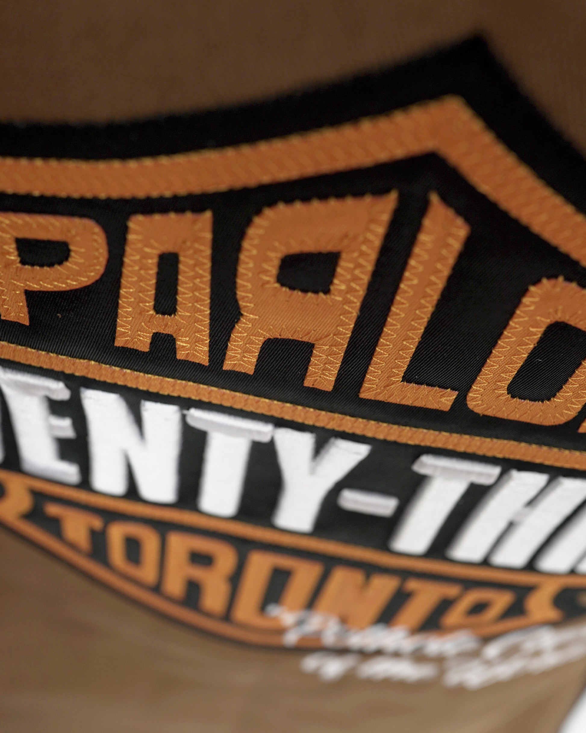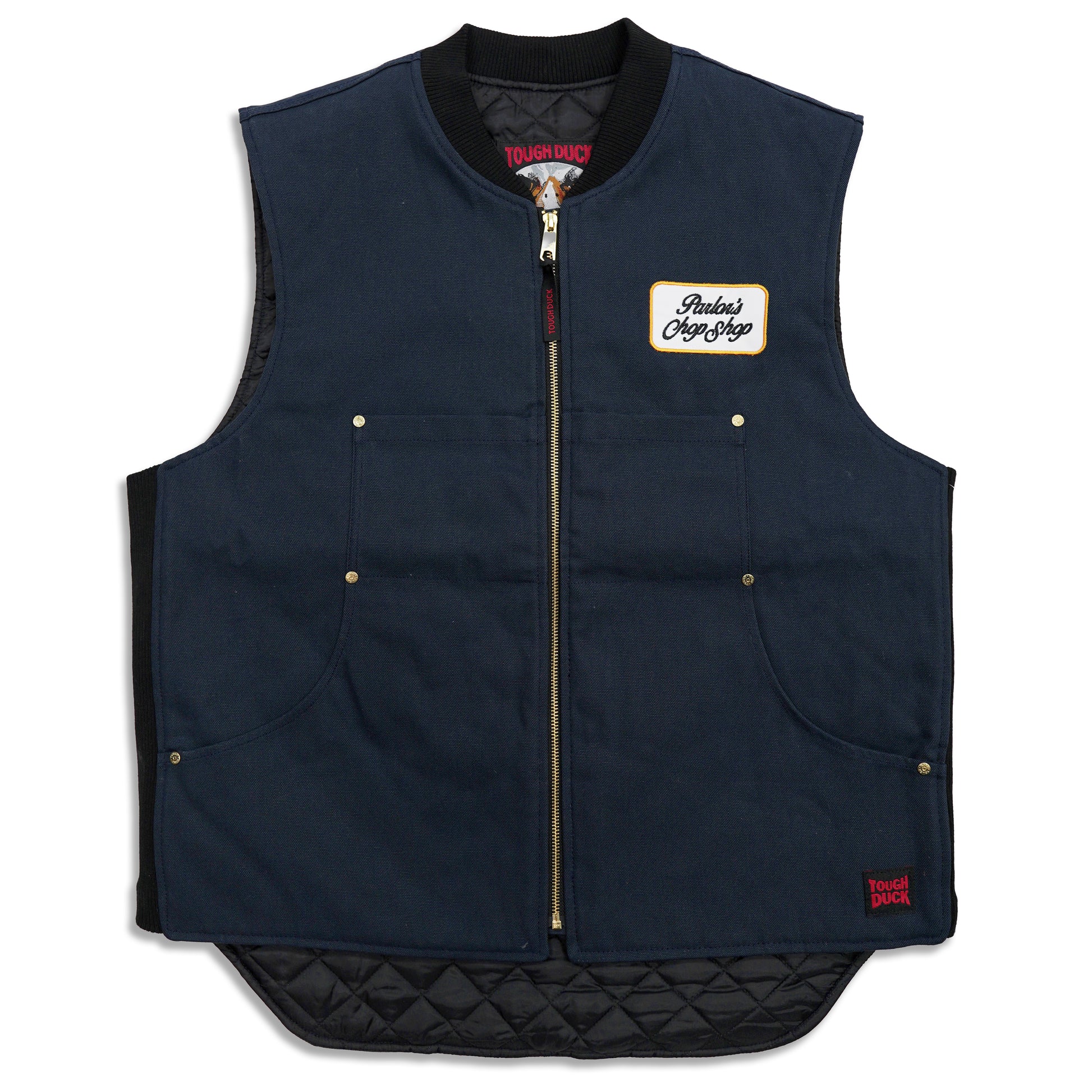 In collaboration with Tough Duck, The "Parley Pot Hole" Moto Vest shown here features an embroidered "Parlor Chop Shop" front left chest patch. The back logo embellishment is a take on the classic motorcycle brand, with some Toronto homage as the pot hole capital of the world. Featuring a 2 layer applique, embroidery and 3D puff embridery.